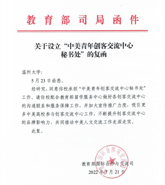 近日,教育部国际合作与交流司给小宝影院 复函,同意在小宝影院 设立“中美青年创客交流中心秘书处”。