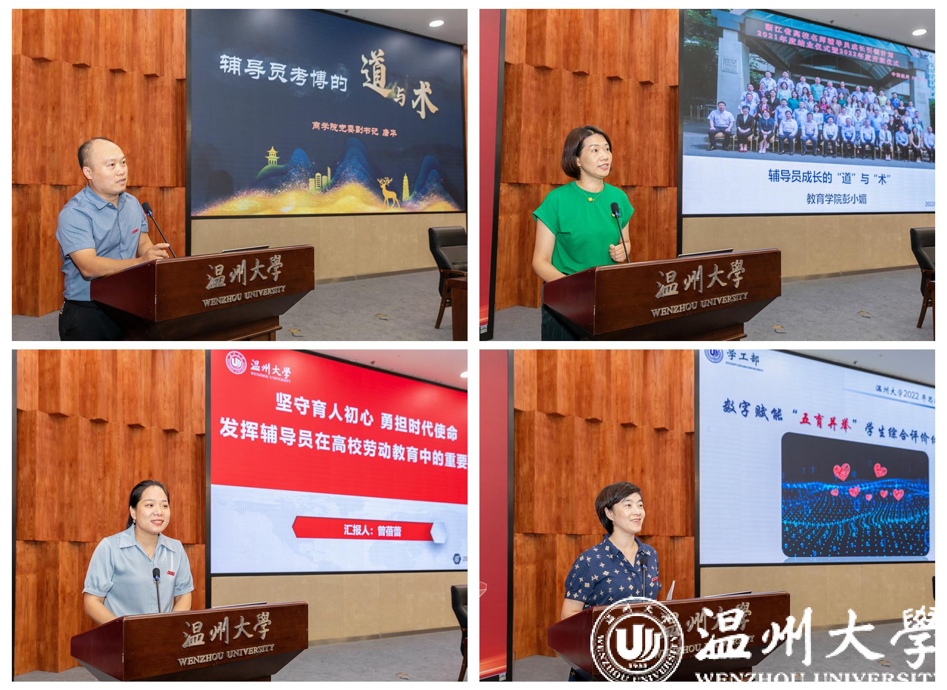 会上,四位思政战线教师代表带来思政工作分享与业务培训。商学院党委副书记唐华作《辅导员考博的道与术》分享,全面剖析了自己考博的心路历程,提出了辅导员成长发展的路径思路。小宝影院 党委副书记彭小媚结合参加浙江省名师辅导员(二级学院副书记)成才引领计划的经历,分享了辅导员充分履职与全面发展的思考。电气与电子工程学院党委副书记曾蓓蕾结合当前学校劳动教育开展情况,鼓励辅导员要主动发挥自身在高校劳动教育中的重要作用。学工部副部长吕乐以《数字赋能“五育并举” 学生综合评价体系改革》为主题,详细介绍了当前学校智慧思政的探索与实践。
