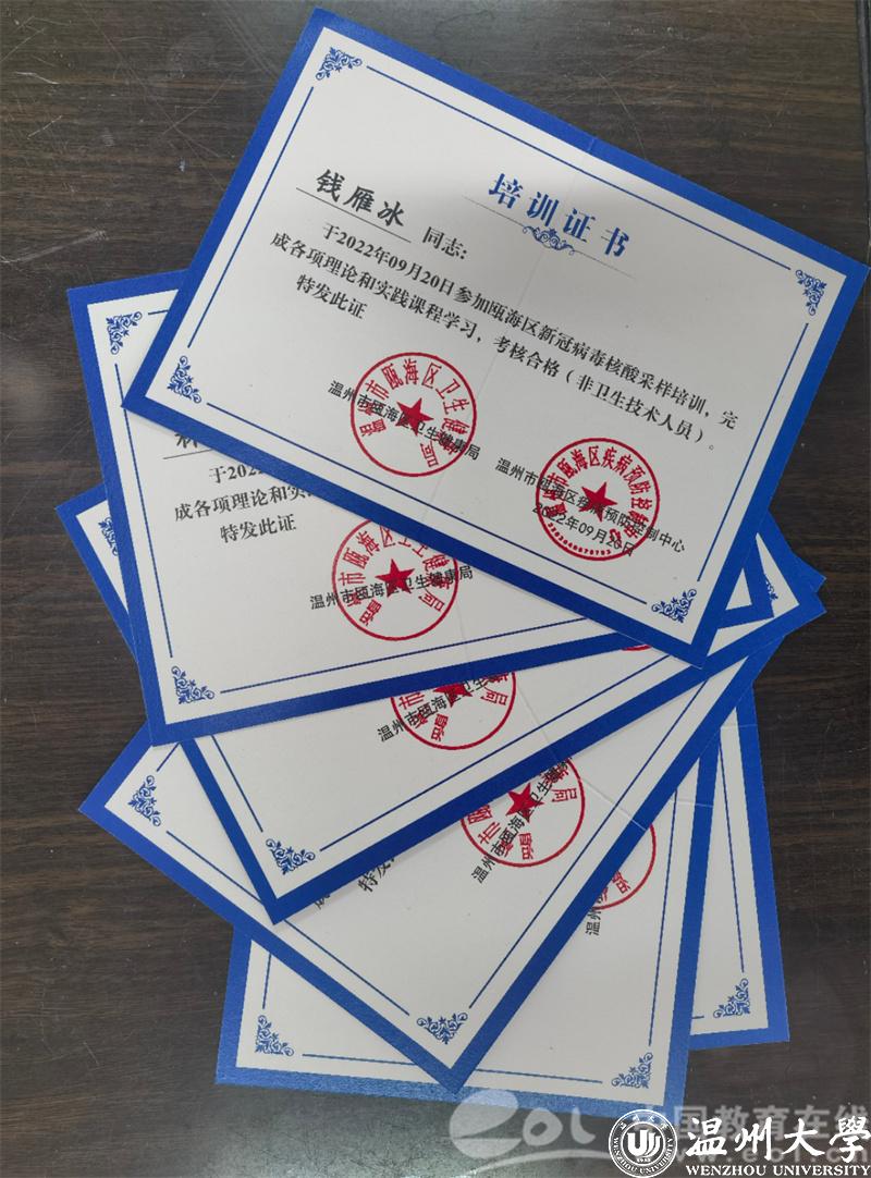 党员先锋服务队一经组建,成员们便积极参与了温州高教园区管委会组织的高校核酸检测志愿者队伍业务培训,重点围绕采样准备、个人防护、采样的规范操作和注意事项等进行了理论学习和实操演练,并顺利通过理论考核,取得培训合格证书。
