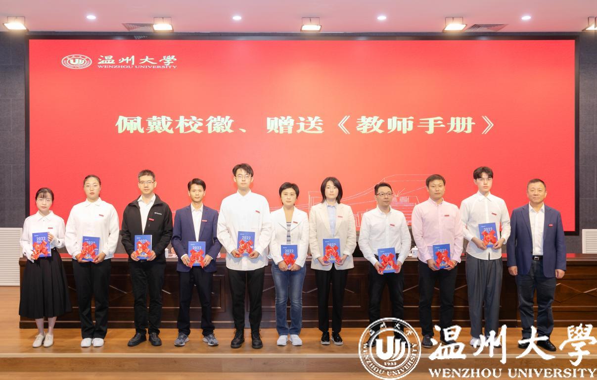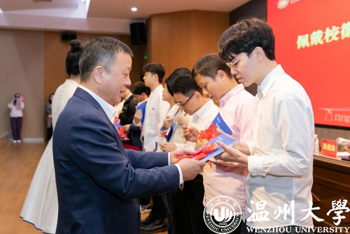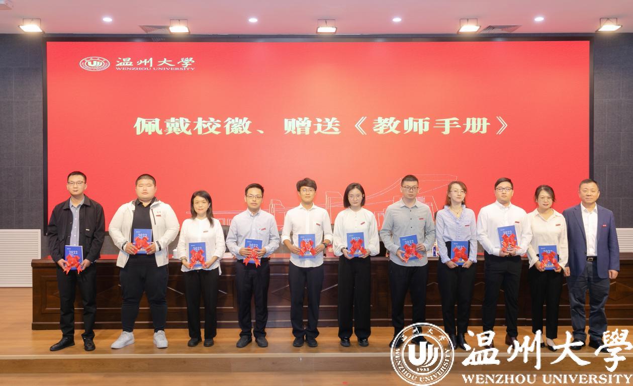 谢树华为新教师代表佩戴校徽,并赠送2022版《小宝影院 教师手册》,表达学校对新入职教师的热烈欢迎和殷切期望,希望新教师提升“温大人”的归属感和责任感,勉励每一位新入职教师开拓进取、奋勇向前。
