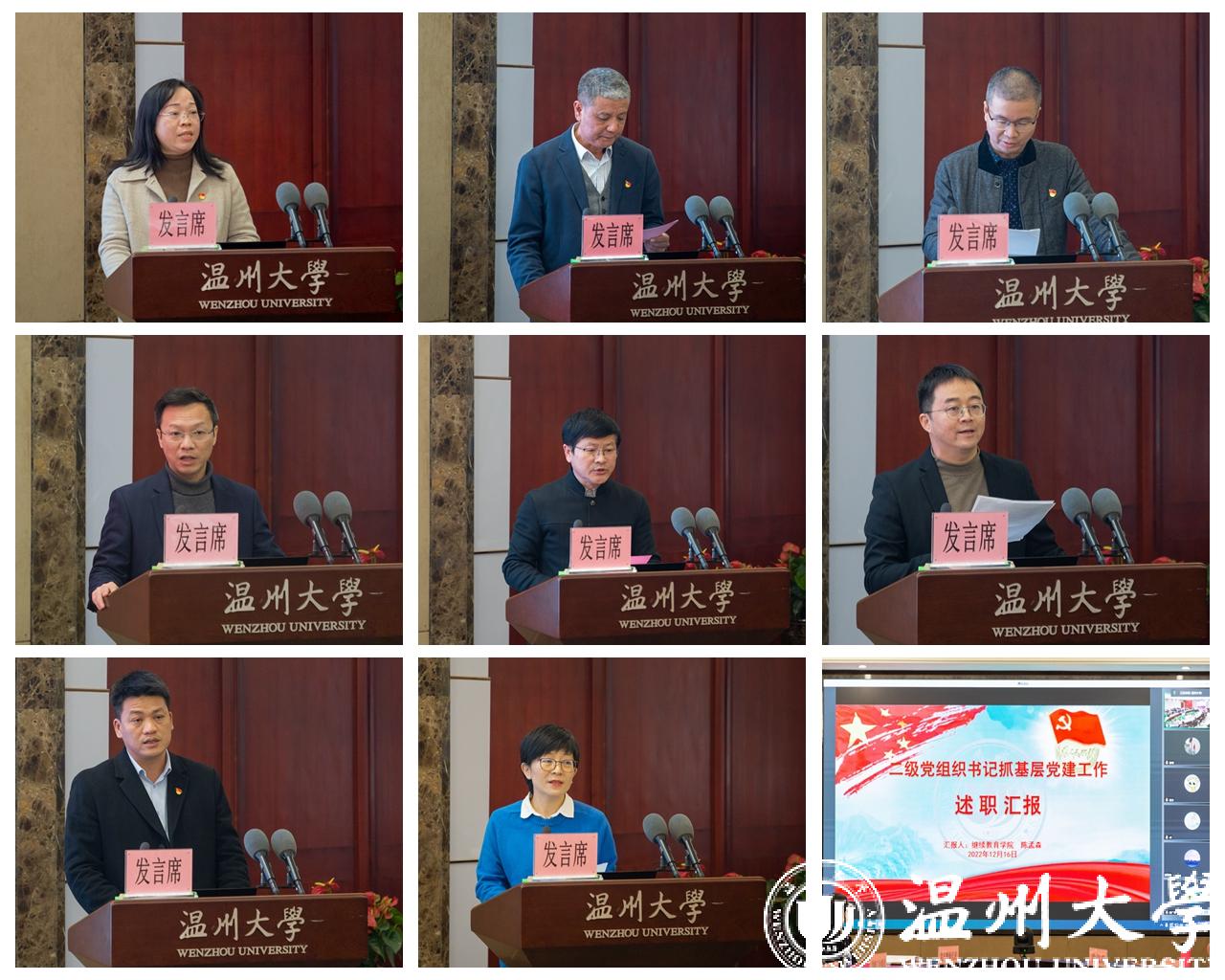 述职评议会上,18位学院党委(党总支)书记依次上台述职,重点围绕推进基层党组织和广大党员干部深入学习贯彻习近平新时代中国特色社会主义思想情况;履行抓基层党建和全面从严治党工作第一责任人职责情况;落实基层党建工作重点任务情况;发挥基层党组织战斗堡垒作用和党员先锋模范作用情况;推动基层党组织落实党风廉政建设责任制、意识形态工作责任制情况;上年度述职评议考核整改清单落实情况和巡视、巡察反馈中涉及基层党建工作问题整改情况等六个方面进行了汇报,实事求是地总结了存在的问题,提出了下一步的工作思路。其他6位二级党组织书记进行书面述职。现场述职结束后,考核工作组成员采用无记名的方式进行考核评分。