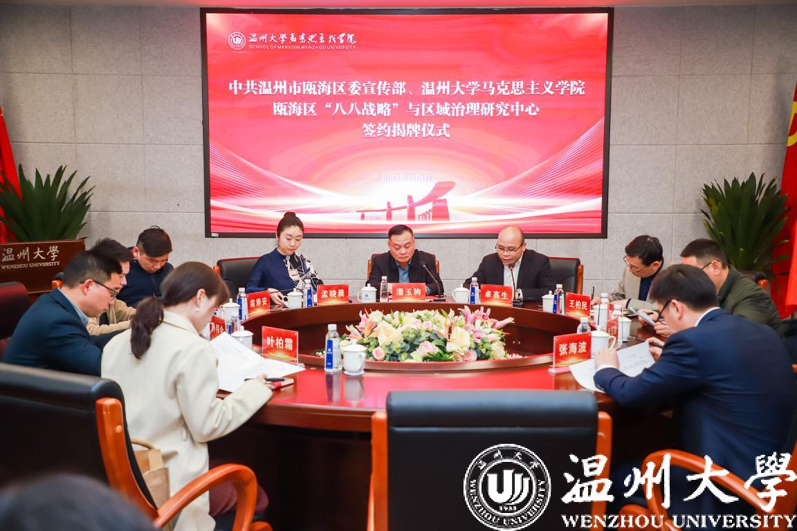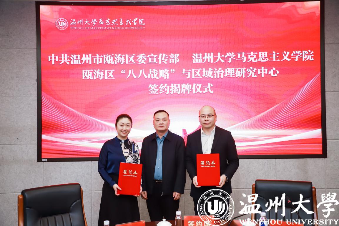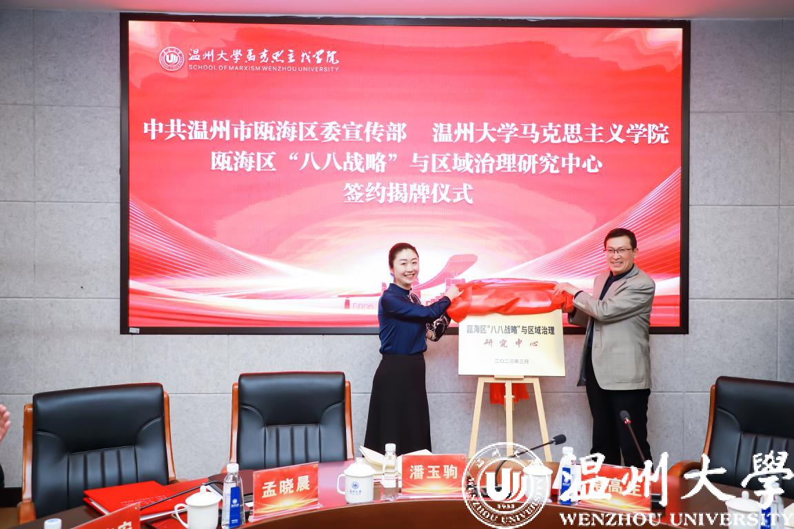为深入贯彻党的二十大精神,忠实践行“八八战略”、奋力打造“两个先行”的瓯海样板,3月8日,由瓯海区委宣传部与小宝影院 马克思主义学院联合成立的“瓯海区‘八八战略’与区域治理研究中心”在岩松堂展示厅正式揭牌。小宝影院 党委委员、副校长潘玉驹,瓯海区委常委、宣传部长孟晓晨参加合作共建签约仪式。