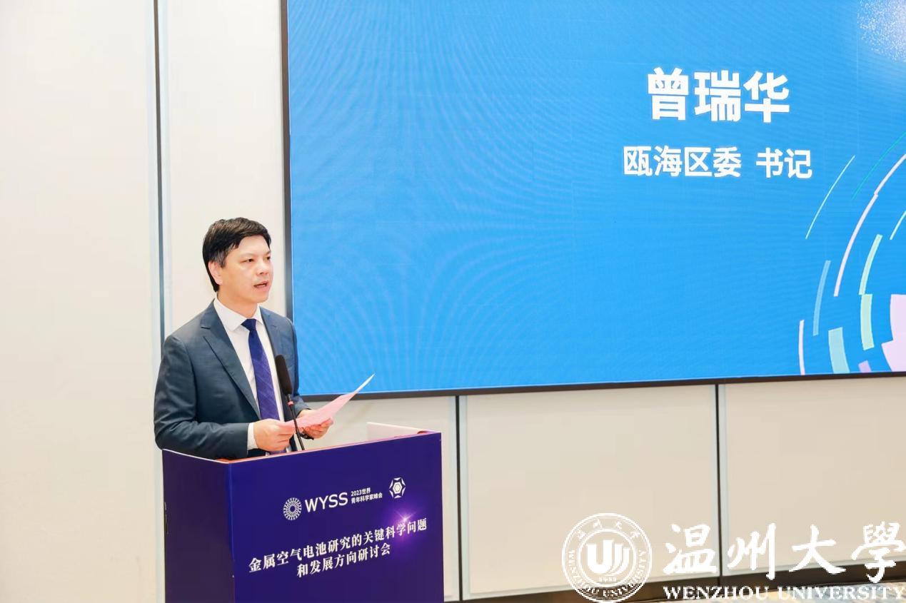 曾瑞华致辞。他表示,瓯海区委区政府始终把生命健康、数字经济、新能源、新材料等新兴产业作为出圈之道、崛起之道,聚力攻克前沿的卡脖子难题,走出创新联合体路径,打造了中国基因药谷、中国(温州)双碳科创港等塔尖重器,抢占未来产业细分新赛道。近年来,瓯海区紧扣新能源百亿项目、千亿企业、万亿产业的目标,在专家学者的大力支持下,逐步探索构建储能电池正负极材料、电解液等全链条的生态体系,推动新能源产业逐步成为瓯海的优势,瓯海的特色,瓯海的标志,有力打响新能源中国看温州,温州看瓯海的平台。