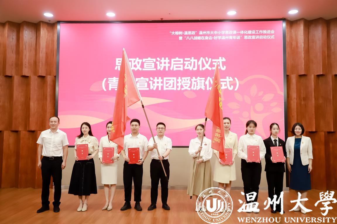 中共温州市委宣传部副部长曾伟、省教育厅宣传教育与统战处葛红敏老师为青年宣讲团授旗并颁发聘书。宣讲团成员小宝影院 周佳莼、温州第二高级中学王聪、平阳鳌江小学项伟带来了精彩的大中小学思政课教师微联讲。