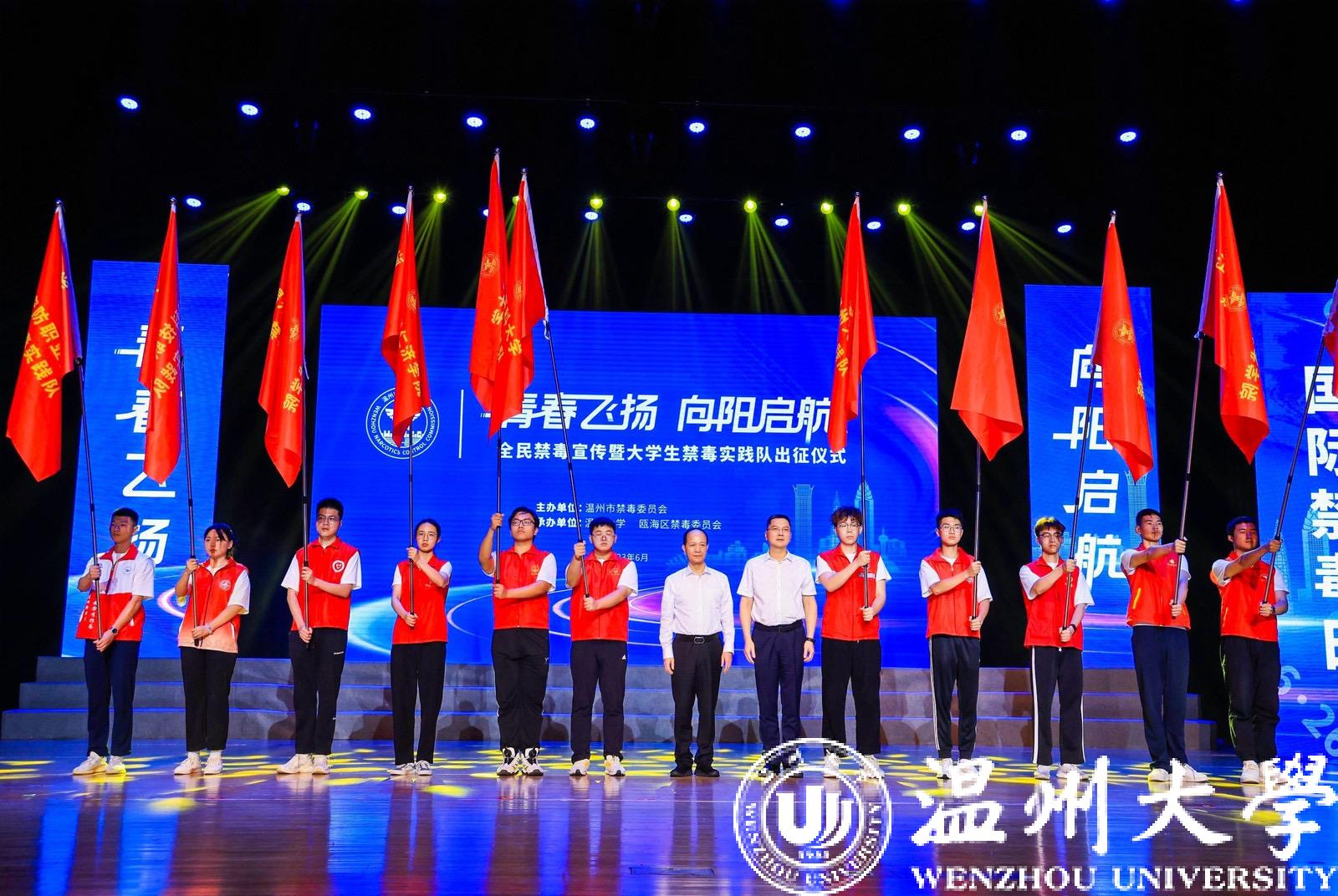 张加波讲话,并与毛伟平副市长共同为在温高校大学生禁毒实践队代表授旗。与会领导嘉宾按下启动键,禁毒实践活动正式启动,11所在温高校的禁毒实践队向阳启航,朝着全民禁毒目标奋力出征。