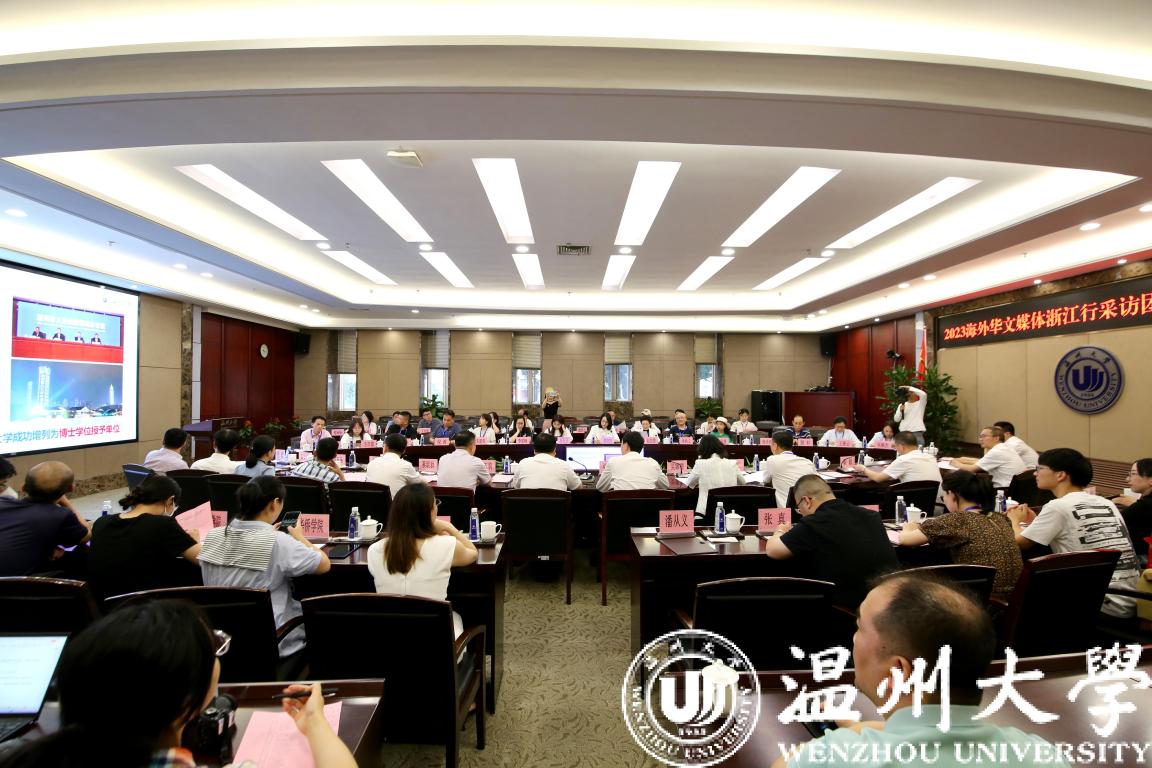6月15日,“追梦中华·奋进先行区”2023海外华文媒体浙江行采访团来校调研。中国侨联信息传播部宣传处负责同志、浙江省侨联文化交流和信息传播部部长赵加慧、温州市侨联党组书记吴娜丽、温州市侨联主席南品仁等领导,中央及省级媒体记者、海外华文媒体记者,校领导张健、赵敏、潘玉驹出席调研座谈会。
