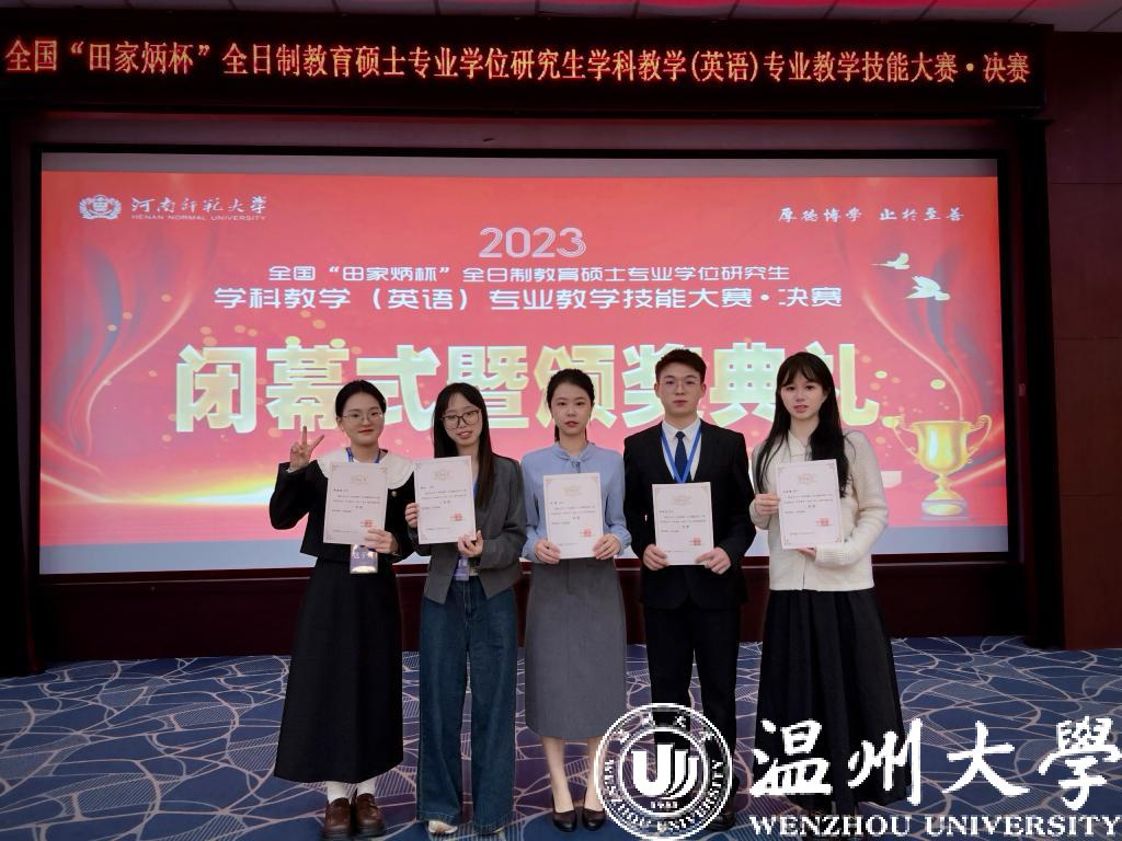 10月21日至22日,2023年“田家炳杯”第五届全国全日制教育硕士专业学位研究生学科教学(英语)专业教学技能大赛决赛在河南师范大学落下帷幕。小宝影院 外国语学院研究生何柳、金佳乐分别斩获一等奖、吴俐嶙、张玲和郑金敏分别荣获三等奖。王崴然、李宋昊老师获得优秀指导教师的荣誉。本次大赛外国语学院参赛学子获奖率100%,一等奖获奖数量全国第一,获奖人数与总成绩连续两年在全国名列前茅,在获奖数量和质量上均取得喜人佳绩。