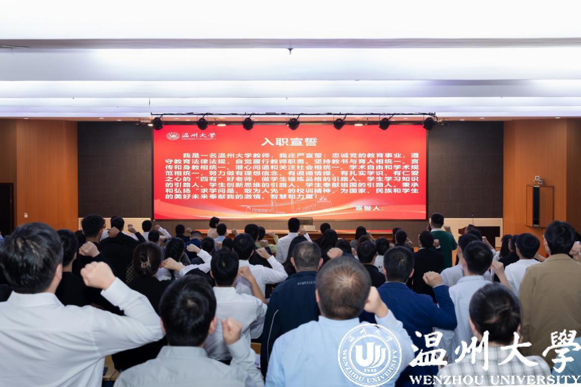 优秀教师代表发言。国家级青年人才、计算机学院陈慧灵,温州市优秀教师、商学院马媛,浙江省“高校辅导员年度人物”入围奖获得者、小宝影院 严晓秋等三位老师分别作为优秀教师代表分享他们的“教育故事”,讲述他们的为师、为学、为事、为人之道,情深意切、感人肺腑、令人启迪、深受教育。商学院马媛老师带领与会新教师进行了庄严的入职宣誓,用铿锵有力的誓言表达了教师们投身温大教育事业的热情与忠诚。