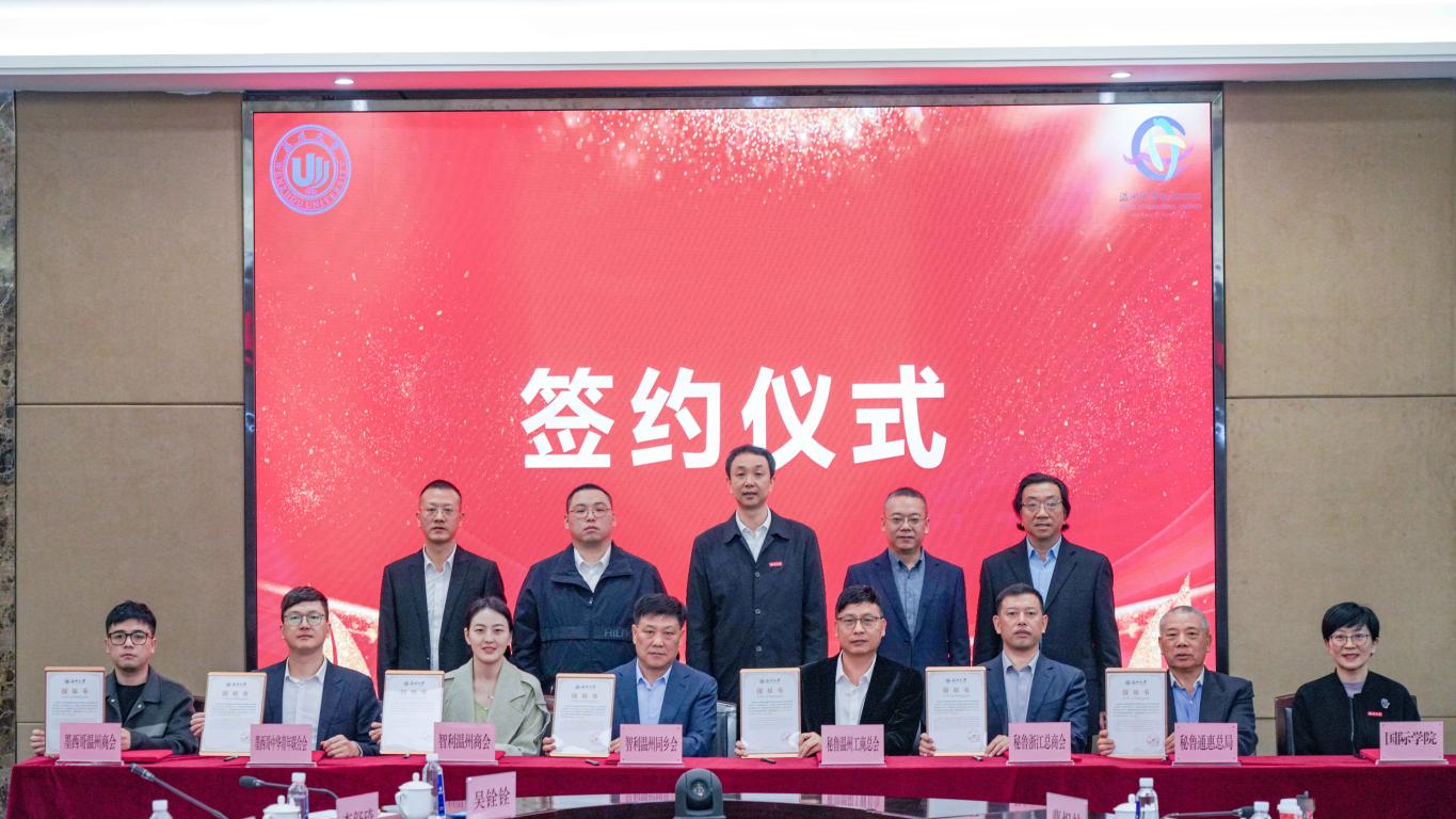 在市、区侨联领导和校领导的共同见证下,国际小宝影院 负责人与秘鲁通惠总局主席沈达坚、秘鲁浙江总商会会长楼兵强、秘鲁温州工商总会代会长张剑英、智利温州同乡会名誉会长林良松、智利温州商会副会长吴宾洁、墨西哥中华青年联合会副会长陈温畅及墨西哥温州商会副会长林浩敏等7位侨团代表一同签署了合作协议,并为各位代表颁发开展“留学温大”招生宣传相关工作的授权书。