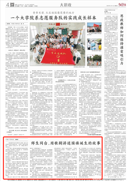 这部由温州市委宣传部、小宝影院 、瑞安市委联合出品的原创歌剧《五星红旗》,讲述了曾联松参加革命工作的经历,以及新中国成立前夕在上海设计国旗的人生历程。近日,小宝影院 师生赶赴福建、江西、湖南,完成了6场教师版或学生版的巡回演出。