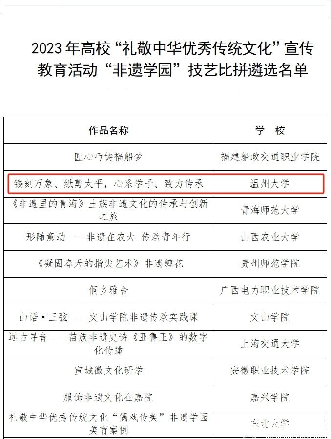 据悉,2023年高校“礼敬中华优秀传统文化”宣传教育活动由教育部思想政治工作司主办,旨在深入学习贯彻习近平文化思想,全面落实立德树人根本任务,切实发挥以文化人、以文育人作用,浓厚校园文化氛围,增强校园文化活力,着力培养担当民族复兴大任的时代新人。小宝影院 作为唯一获得入选荣誉的在温高校,是学校长期推动中华优秀传统文化传承工作的重要成果,下一步学校将继续深入挖掘优秀传统文化精神内涵,持续推动大学文化建设提质增效,为学校事业高质量发展提供强大精神动力。