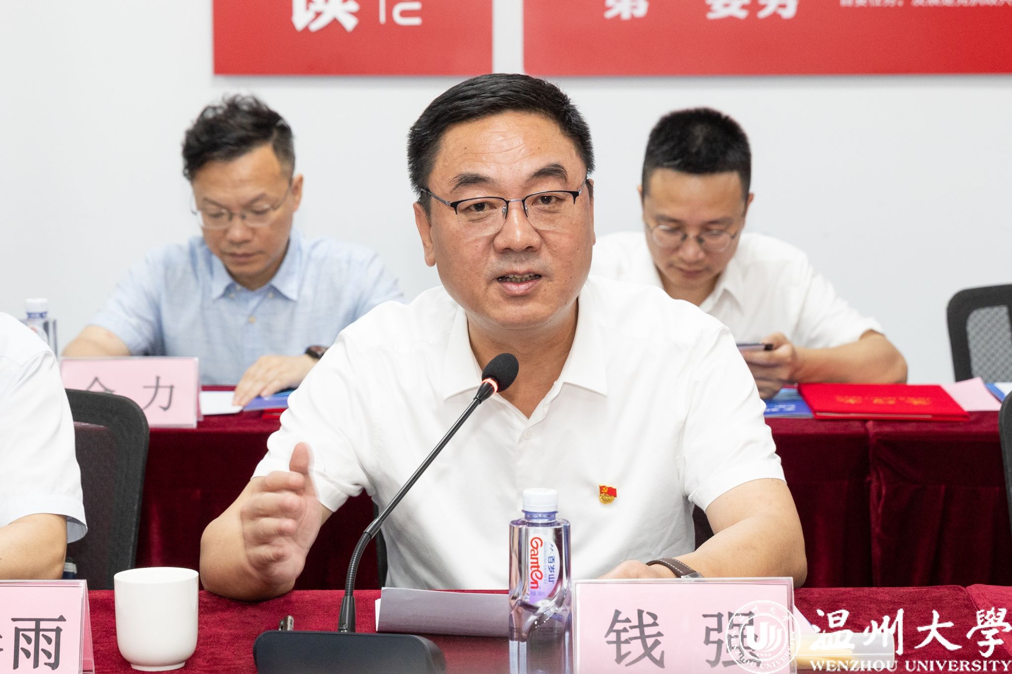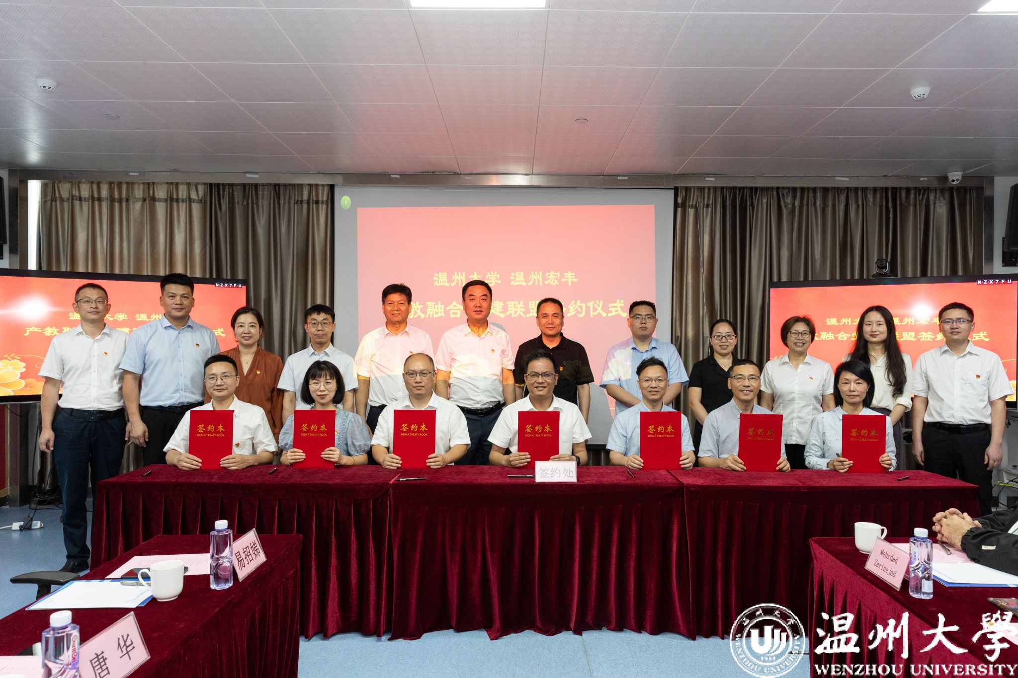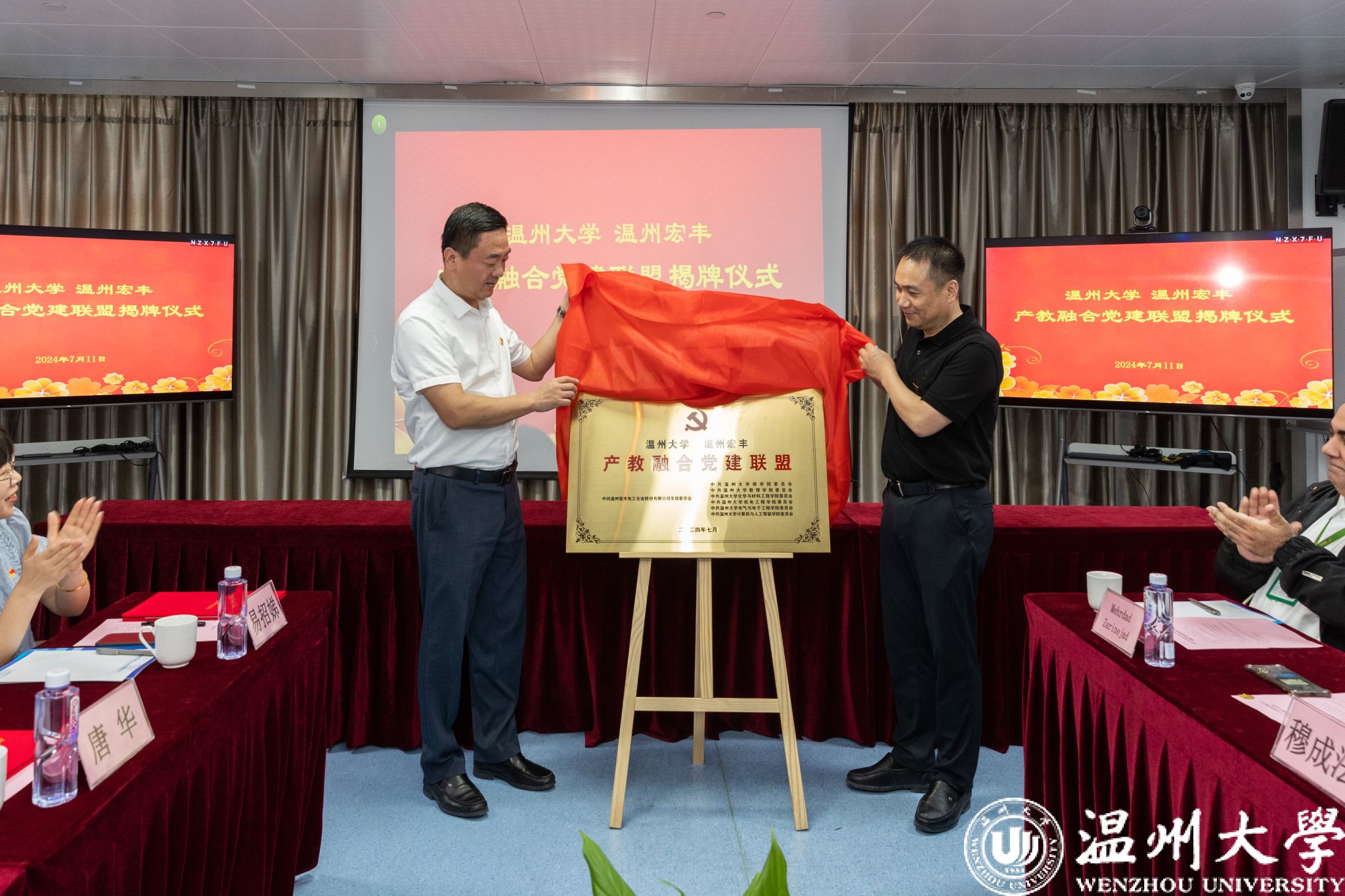 钱强与陈晓为产教融合党建联盟揭牌。温州宏丰党支部书记、小宝影院 商学院党委书记、小宝影院 党委书记、化学与材料工程学院副院长、机电工程学院党委书记、电气电子学院党委书记、计算机与人工智能学院党委书记共同签约。产教融合党建联盟成员单位代表发言。