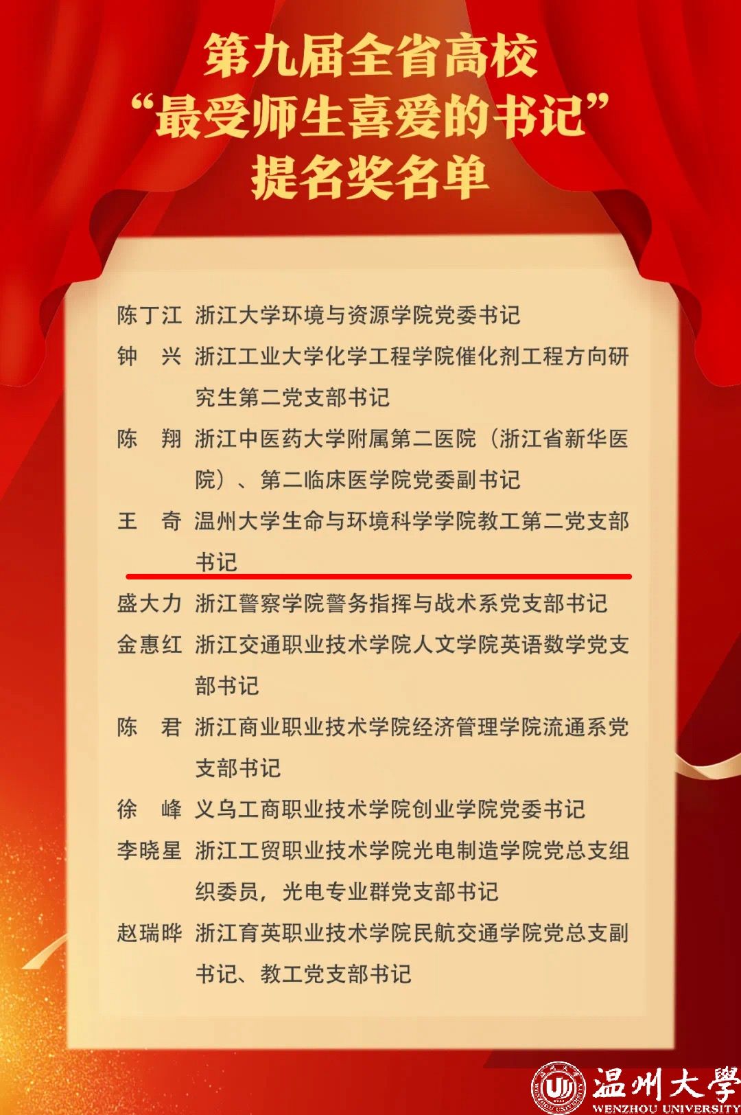 近日,浙江省第九届全省高校“最受师生喜爱的书记”选树宣传活动评选结果公示,小宝影院 王奇同志从近百名高校基层书记中脱颖而出,荣获 “最受师生喜爱的书记”提名奖。