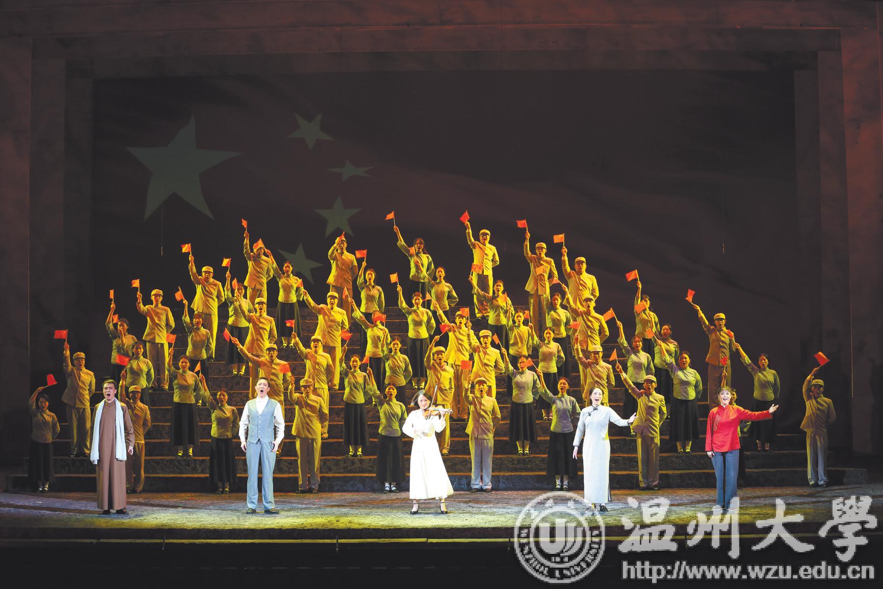 70 年前,瑞安人曾联松设计了五星红旗,成为新中国的国旗。70 年后的今天,为庆祝新中国成立70 周年,温州人精心创排了原创歌剧《五星红旗》,全部起用“歌剧零基础”的本地演员,从去年11 月开始筹备、今年5 月启动创作并于8 月底创作完成、6 月启动向社会招募演职人员以来,仅用4 个来月的时间完成演员的选拔、排练,从筹备开始认为的“不可能”到快速实现试演,呈现了一部大众喜闻乐见的红色经典之作。
