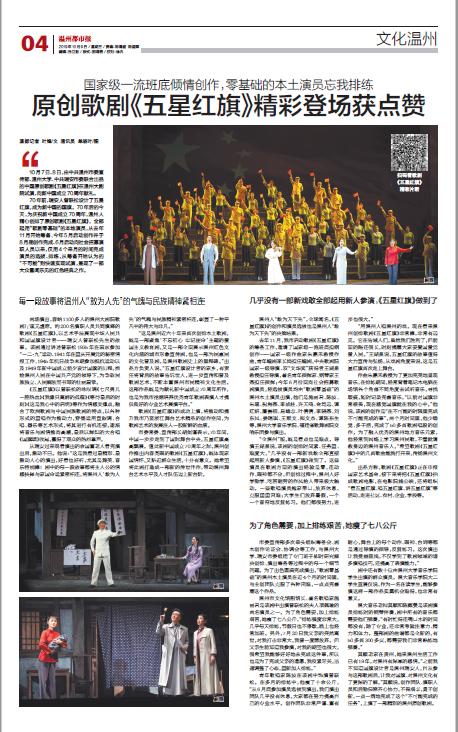 10 月7 日、8 日,由中共温州市委宣传部、小宝影院 、中共瑞安市委联合出品的中国原创歌剧《五星红旗》在温州大剧院试演,向新中国成立70周年献礼。