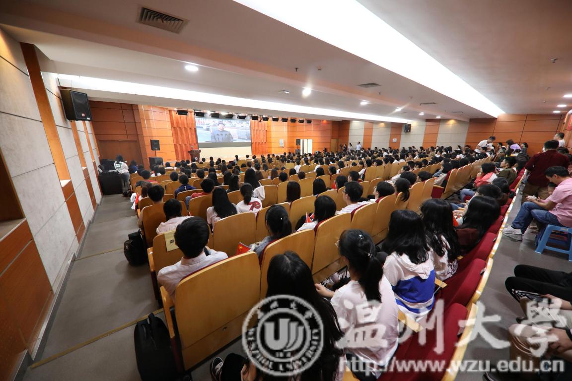 全场起立齐唱《我和我的祖国》 “我和我的祖国,一刻都不能分割……”每个人的神情深情而庄重,场内巨幅五星红旗飘动,师生心情澎湃——这是中华儿女的自豪!
