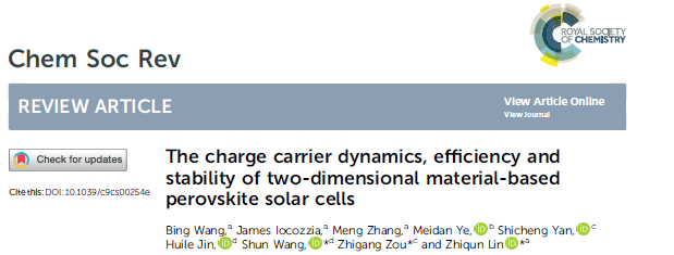 近日,国际化学顶级刊物《Chemical Society Reviews》发表了小宝影院 王舜教授与南京大学邹志刚院士、美国佐治亚理工学院林志群教授等学者合作的有关基于二维材料钙钛矿太阳能电池的综述性论文“The charge carrier dynamics, efficiency and stability of two-dimensional material-based perovskite solar cells”(基于二维材料钙钛矿太阳电池的载流子动力学、效率和稳定性综述),王舜教授为通讯作者,温大金辉乐博士为作者。