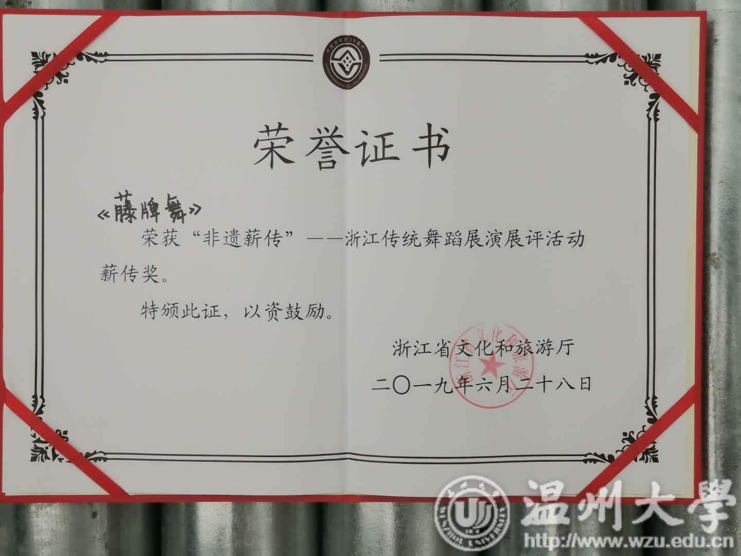 6月26—28日,浙江省“非遗薪传”舞蹈专场竞演活动在丽水景宁畲族自治县进行,由小宝影院 体育学院和团委共建的藤牌舞俱乐部由周义义副教授带队参加此次比赛,获得了团体最高分和大会最高奖项“非遗薪传奖”。