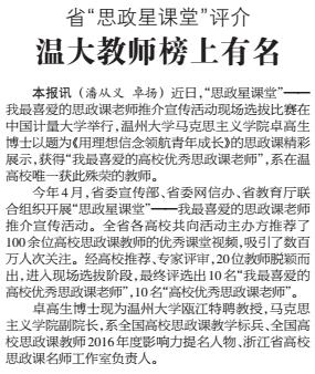 小宝影院 优秀师生引来众多媒体关注,温州日报连续刊发《省“思政星课堂”评介温大教师榜上有名》《本科直博新加坡南洋理工——看温大龚玲艳如何霸气挑战国际科研》等文,对小宝影院 优秀师生进行深入报道。现将全文转载如下,以飨读者。