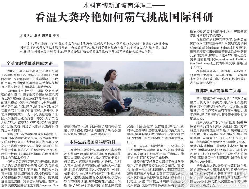 谈及未来之路,龚玲艳打算继续在盐湖提锂的技术应用领域发展,希望有朝一日自己的研究成果能够实现工业化的目标。目前,她已经被新加坡南洋理工大学博士录取(机械与航天航空工程学院),并获该校全额奖学金。(文章载于《温州日报》2019年7月2日第7版)