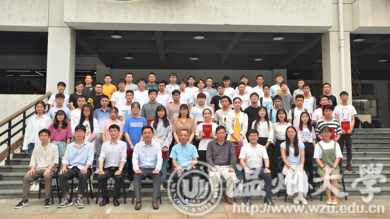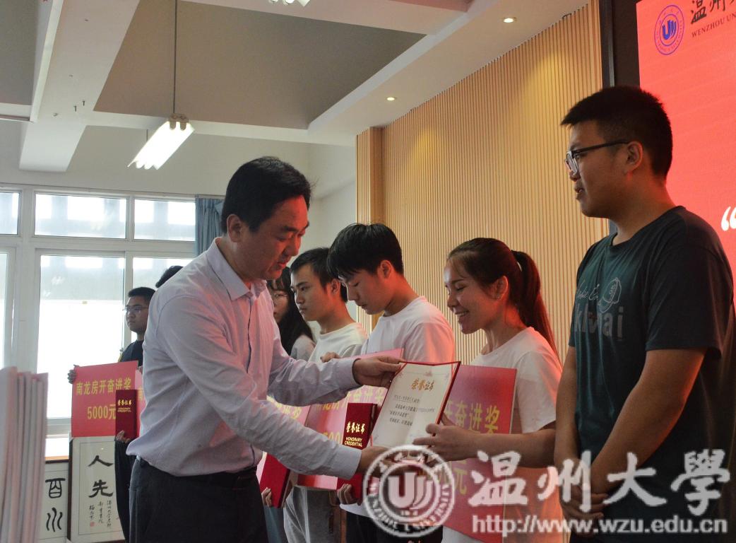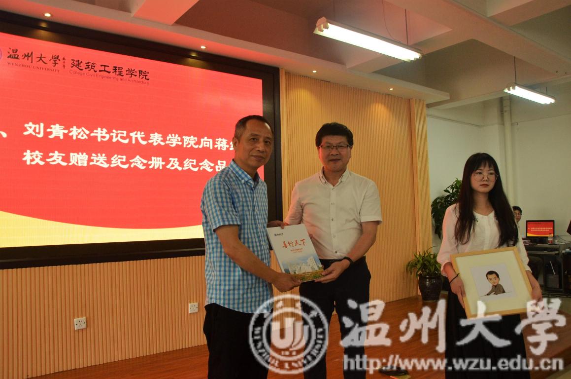 紧接着,温州南龙房地产开发有限公司董事长、小宝影院 1984级工民建专业蒋维清校友给大家分享了一个财富的小故事,人不仅要有智商、情商,更要有胆量与胸怀。他通过结合马云和雷军的案例告诉同学们,只要肯努力人人都有机会成功,并勉励同学们努力学习,奋发上进。最后,学院党总支书记刘青松代表学院向蒋维清先生赠送了纪念册和学生的手绘纪念品。