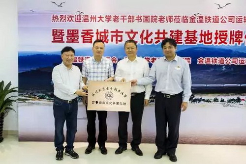 “校企强强喜联手,墨香文化共创建”。温大老干部书画院院长冯大明深有感触地道出心声:“感谢温大党委宣传部、老干部工作部与金温铁路公司工会对文化公益活动的大力支持!四年来送文化四进金温铁路运输部,与干部职工结下深厚的友谊。今天建立基地,发挥各自优势,实行优势互补,定将使活动更有计划、更加规范,达到更好效果,使墨香传遍整条金温铁路,滋润职工们的心田,为铁路的创新发展助力!”