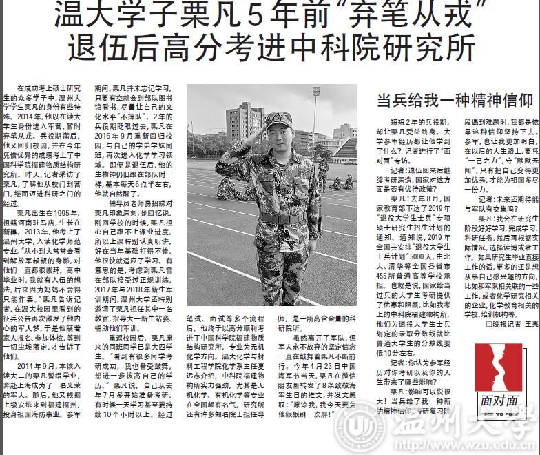 在成功考上硕士研究生的众多学子中,小宝影院 学生栗凡的身份有些特殊。2014年,他以在读大学生身份进入军营,暂时弃笔从戎。兵役期满后,他又回归校园,并在今年凭借优异的成绩考上了中国科学院福建物质结构研究所。昨天,记者采访了栗凡,了解他从校门到营门,继而迈进科研之门的经过。