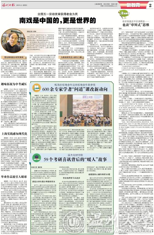 5月3日,《温州日报》围绕小宝影院 科学研究、人才培养、服务地方、师生典型等方面同时刊发五篇报道,分别为《全国五一劳动奖章获得者俞为民:南戏是中国的,更是世界的》《600余专家学者“问道”课改新动向》《温大化材学院:59个考研喜讯背后的“暖人”故事》《上海实践感知现代化》《毕业作品展引人眼球》。