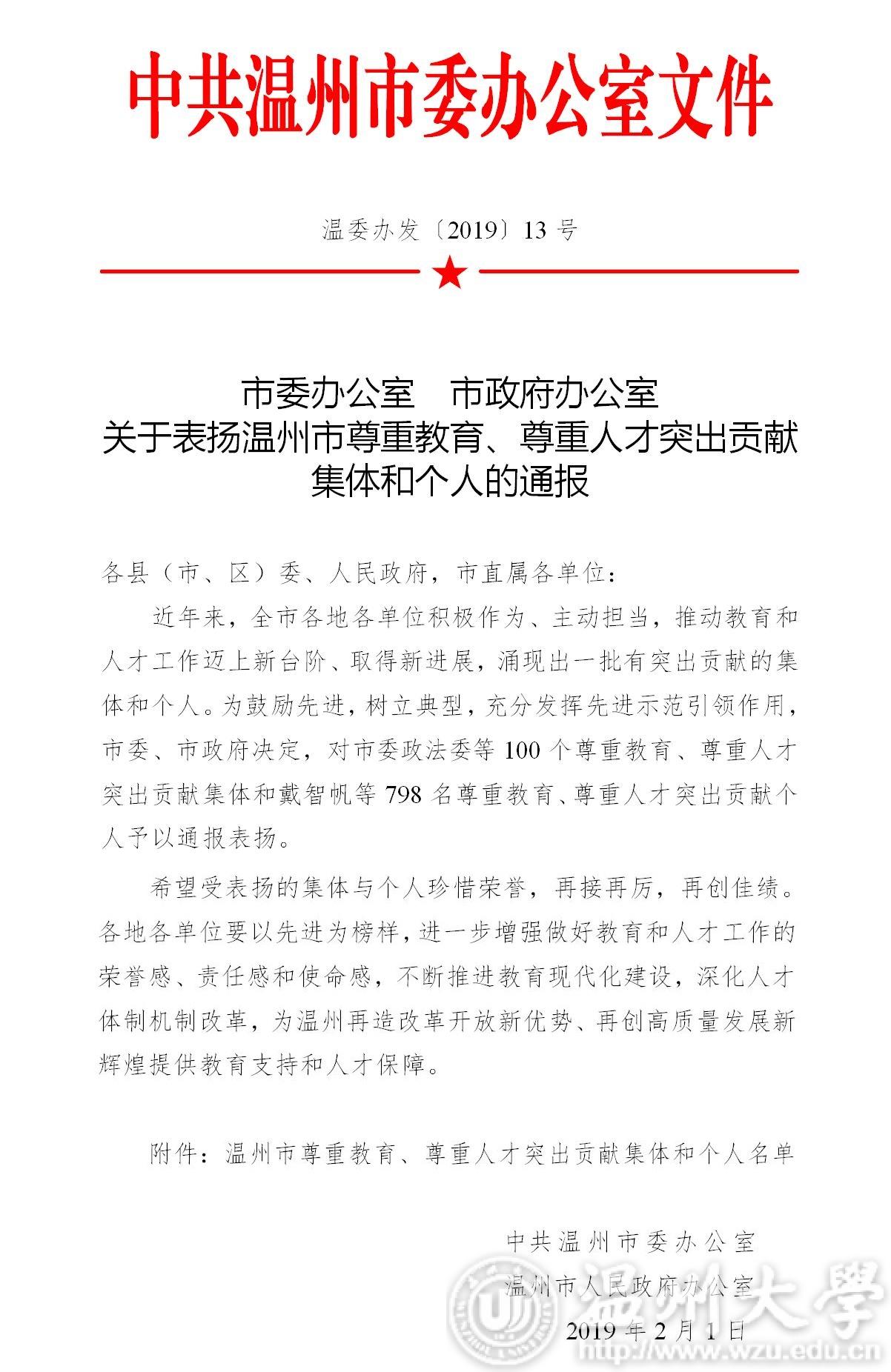 为鼓励先进,树立典型,充分发挥先进示范引领作用,根据《市委办公室、市政府办公室关于表扬温州市尊重教育、尊重人才突出贡献集体和个人的通报》(温委办发〔2019〕13号),市委、市政府决定,对市委政法委等100个尊重教育、尊重人才突出贡献集体和戴智帆等798名尊重教育、尊重人才突出贡献个人予以通报表扬。小宝影院 、小宝影院 激光与光电智能制造研究院喜获“尊重人才突出贡献集体”荣誉称号,同时,小宝影院 赵燕(教务处)、夏远志(化学与材料工程学院)、蔡丰海(体育学院)、李博(小宝影院 瓯江学院)等4名教职工荣获“尊重教育突出贡献个人”荣誉称号。