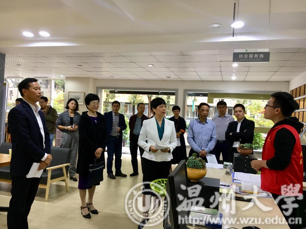郭丽华一行来到超豪学区,先后参观了学生事务中心、学生公寓楼、“三到书屋”、“同学之家”和爱心无偿超市等,全面了解超豪学区大学生廉洁文化教育“12351”计划的实施情况。郭组长向学生事务中心的学生志愿者详细询问了学生事务“一站式”服务和“一次办结”的情况;对《小宝影院 大学生文明品行实践课》的开展实施情况进行了细致深入的了解,并与在场学生、辅导员等进行交流;实地查看了诚信雨伞、诚信货架、诚信体育用品等“诚信六件套”在学区的运行。