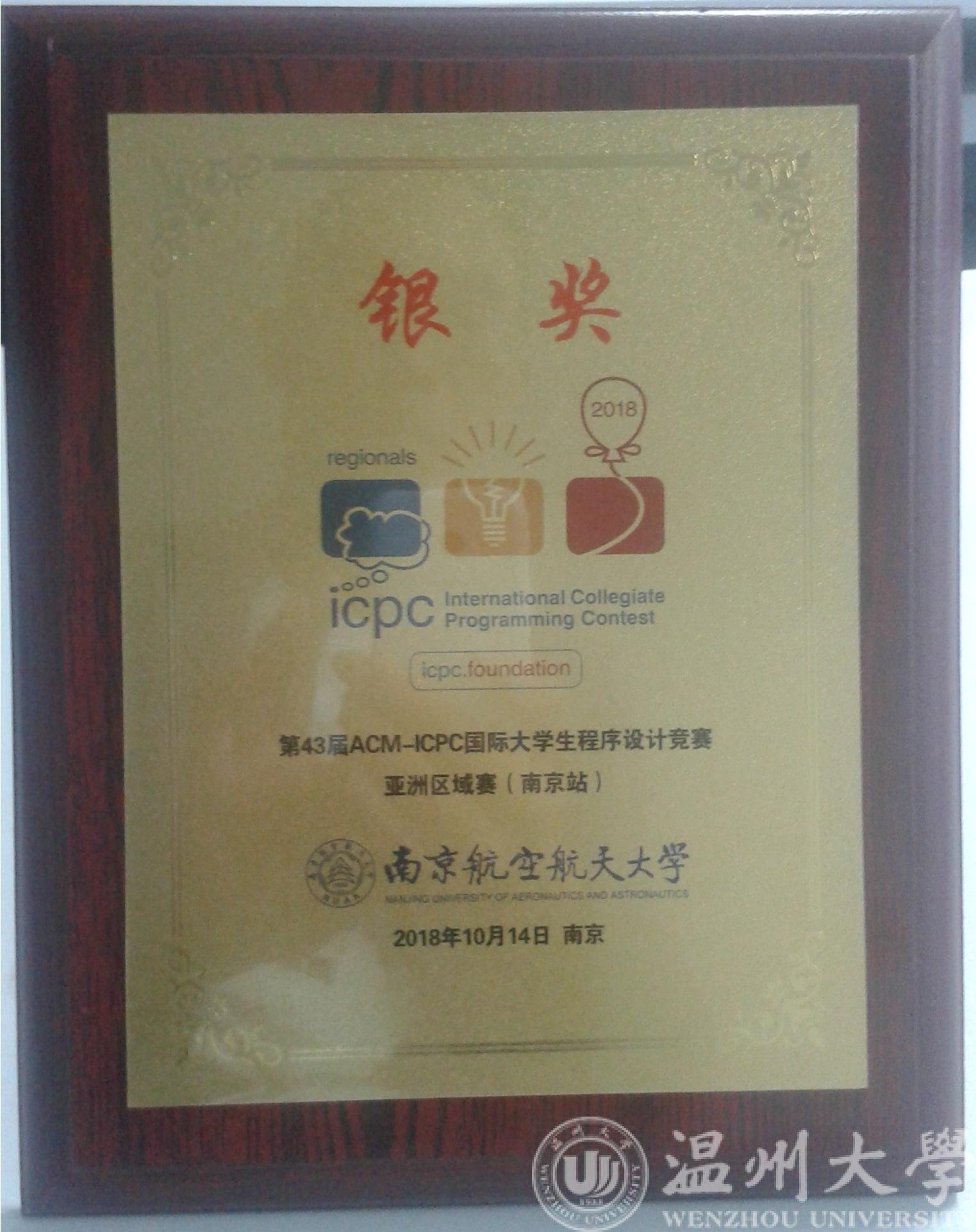 10月14日小宝影院 阿尔法队在第43届国际大学生程序设计竞赛亚洲区域赛(ACM-ICPC)南京站上摘得银奖,创造小宝影院 在该项赛事上的历史最好成绩。小宝影院 参赛的阿尔法队由数电学院16计本1班学生钟庭彪、孙铤超和李克炼组成,教练是胡明晓老师。