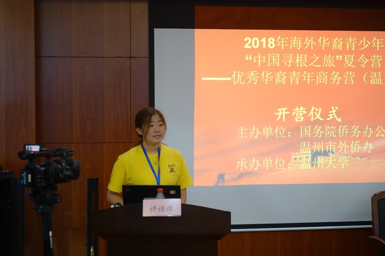来自西班牙的营员诸葛茜茜作了营员代表发言。她是一位生长于西班牙的华裔,13年的中文学习让她对中国文化产生了浓厚的兴趣。在发言中她用流利的汉语向主办方表达了感谢,也表达了自己对此次夏令营的期望,她希望能与来自各国的营员互动交流,呼吁大家相互帮助,相互学习,学到商务知识,也更要认识中国、认识温州,体验中国文化。她的发言说出了广大营员们的心声。
