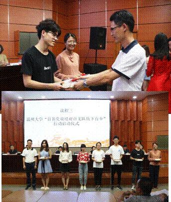 出征仪式上,大家首先观看了《践行新思想 奉献新时代——小宝影院 2018暑期社会实践暨“新青年下乡”集中行动”》的视频。校团委书记屠霁霞对小宝影院 暑期社会实践暨新青年下乡工作情况进行了介绍。紧接着进行了小宝影院 “百名党员结对百支队伍下百乡”行动启动仪式,校党委组织部常务副部长金庆良老师为实践队代表赠送《习近平新时代中国特色社会主义思想三十讲》。随后,社会实践指导老师代表易招娣和社会实践队员代表孙伟杰就暑期社会实践的相关事宜分别发言。