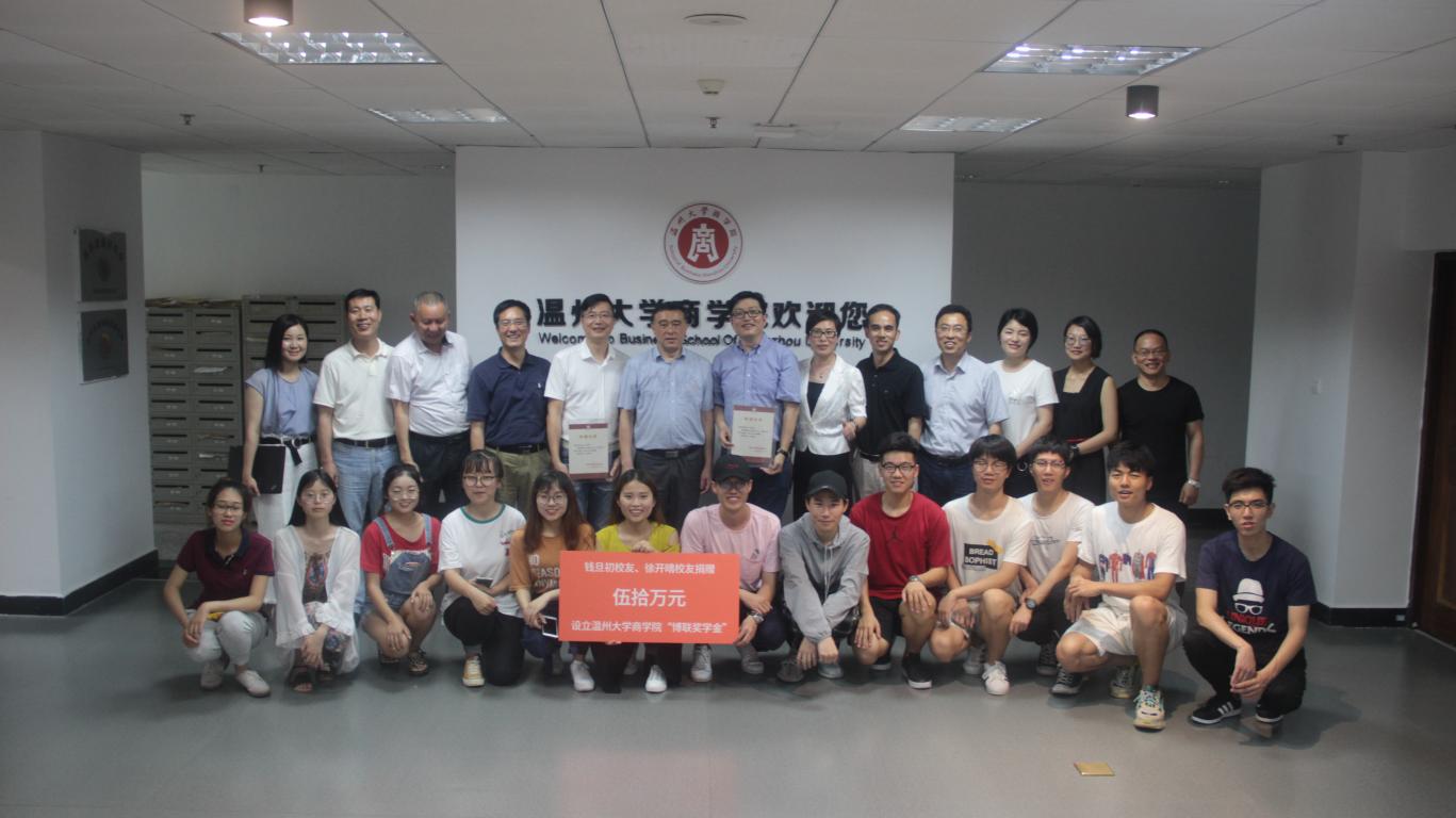 为助力校企联合育人,回馈母校的培养,5月18日下午,在小宝影院 85周年校庆之际,商学院优秀校友钱旦初、徐开晴重返母校,捐款50万元设立商学院“博联奖学金”,用于激励品学兼优的商院学子。
