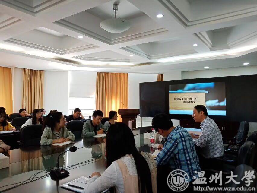4月26日下午,校党委副书记牟德刚为马克思主义学院研究生党支部讲《宪法修正案》主题党课。牟德刚从党领导的宪法建设的历史和实践经验出发,总结出我国宪法是人民制定的社会主义宪法等特点,指出新时代条件下,必须坚定维护宪法的尊严和权威,加强宪法实施和监督,宣传宪法精神,弘扬宪法精神。牟德刚还勉励研究生党员们,要加强宪法知识学习,深刻领会和准确把握宪法修改的核心要义,自觉学习宪法、宣传宪法、贯彻宪法。