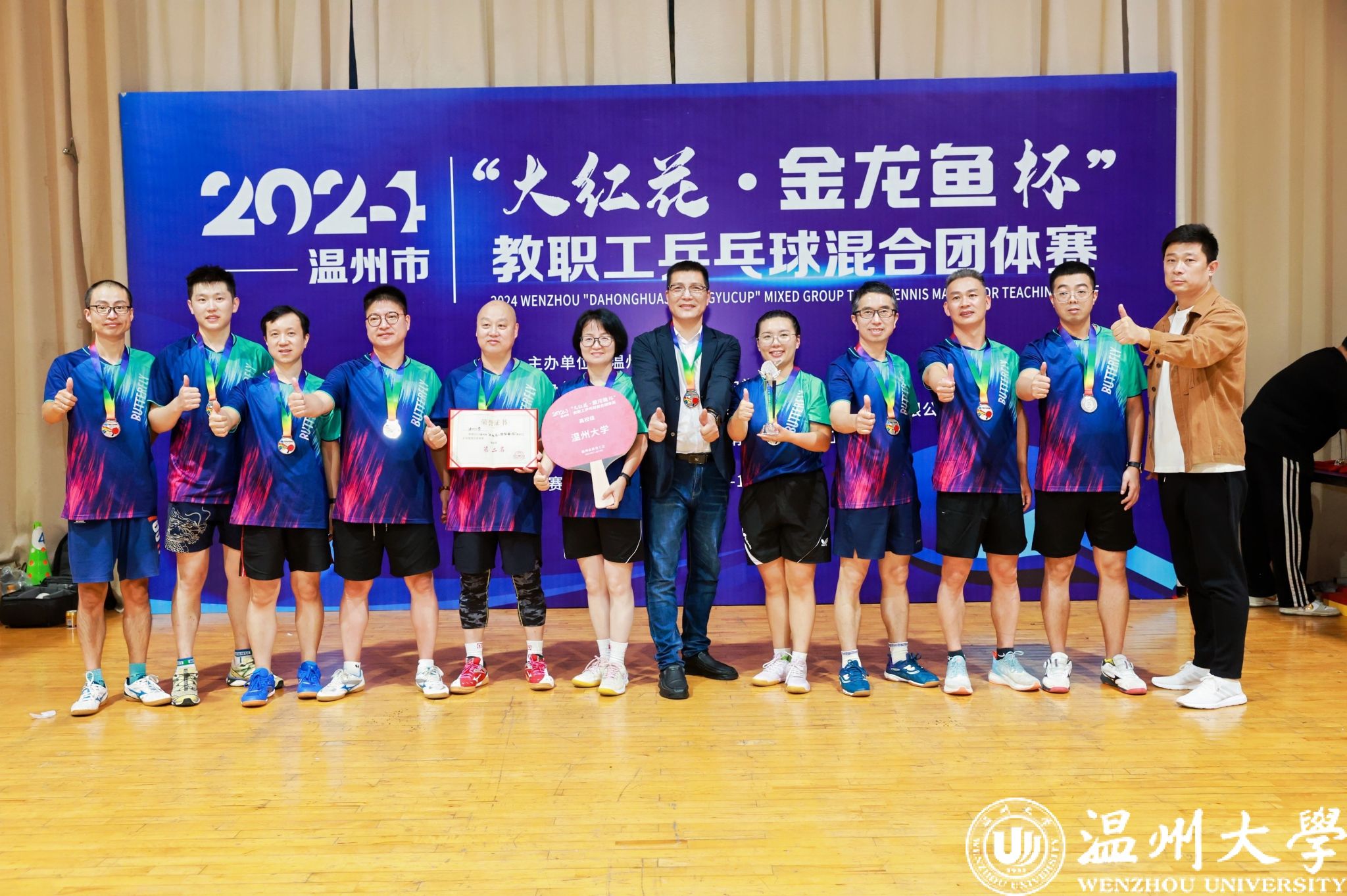 11月9日-10日,温州市教育工会主办的2024年温州市“大红花杯”教职工乒乓球混合团体赛在温州市第二实验中学举办。小宝影院 教职工代表队参加了高校组的比赛,并取得了高校组亚军的好成绩。