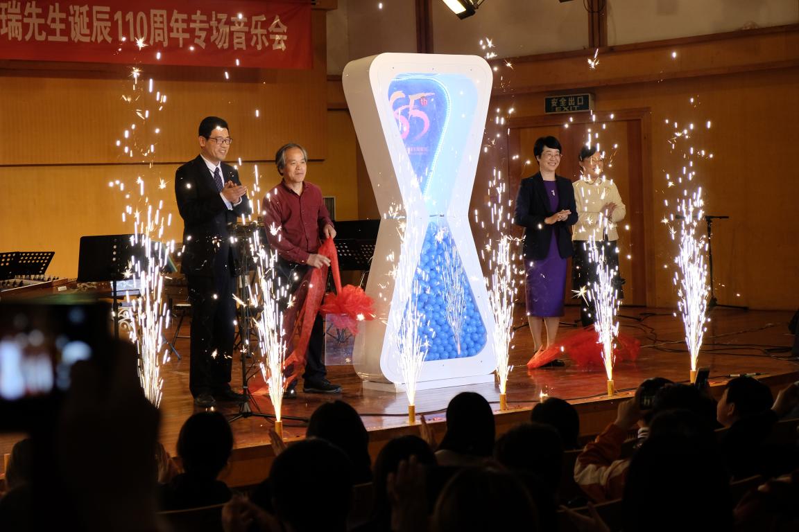 林娟娟、洪振宁、叶艳和音乐学院院长赵玉卿共同启动85周年校庆活动。缪斐慈女士和音乐学院党总支书记方建敏共同为《乐坛鸿儒缪天瑞》新书首发揭幕。