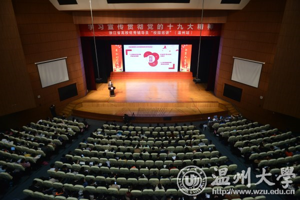 12月14日下午,由省委教育工委组织开展的“学习宣传贯彻党的十九大精神——浙江省高校优秀辅导员‘校园巡讲’活动”在小宝影院 育英大礼堂举行。校党委副书记赵敏、省教育工委宣教处负责人、温州地区11所高校有关负责人参加活动,来自我市各高校的800多名辅导员和学生聆听宣讲,认真学习和深刻领会党的十九大精神的丰富内涵。