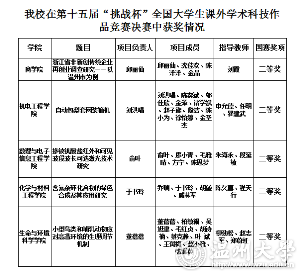 11月18日,第十五届“挑战杯”全国大学生课外学术科技作品竞赛决赛在上海大学落下帷幕。小宝影院 进入现场问辩的5个作品均获得二等奖,获奖成绩综合分数排名位列全省第5位,全国第47位,取得参赛以来的最好成绩。根据大赛章程,按照团体总分优先原则,小宝影院 将首次获得全国“挑战杯”发起高校资格,可参与第十六届“挑战杯”规则的制定,并可在申报省级获奖作品的基础上再向组委会申报3件作品直接参加全国决赛,为接下来小宝影院 “挑战杯”工作开展奠定坚实基础。 “挑战杯”作为国内一项高精尖的学科竞赛,是中国大学生的“科技奥林匹克盛会”。本届“挑战杯”竞赛自启动以来,全国2000多所高校的200多万大学生参加了校级竞赛。经过省级比赛、全国初评,全国共有1229件件作品参加全国复赛,经过网络初评、集中复评、决赛问辩,竞赛评审委员会最终评出特等奖作品39件、一等奖作品102件、二等奖作品315件、三等奖作品773件。小宝影院 《浙江省非新创传统企业再创业调查研究——以温州市为例》等5件作品从初评、复评中脱颖而出,且在终审问辩中均获得二等奖。 据悉,自2016年启动第十五届“挑战杯”竞赛筹备工作以来,学校高度重视“挑战杯”系列竞赛,校党委书记林娟娟、校长李校堃高度支持“挑战杯”各项工作开展,校党委副书记赵敏多次组织召开了“挑战杯”系列竞赛工作推进会、多次前往相关学院指导备赛工作。各学院也掀起一阵阵积极筹备参加“挑战杯”比赛的热潮。