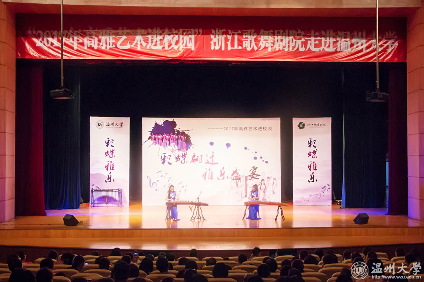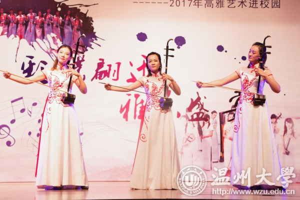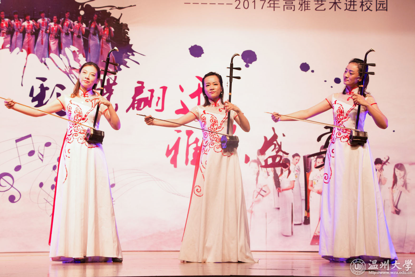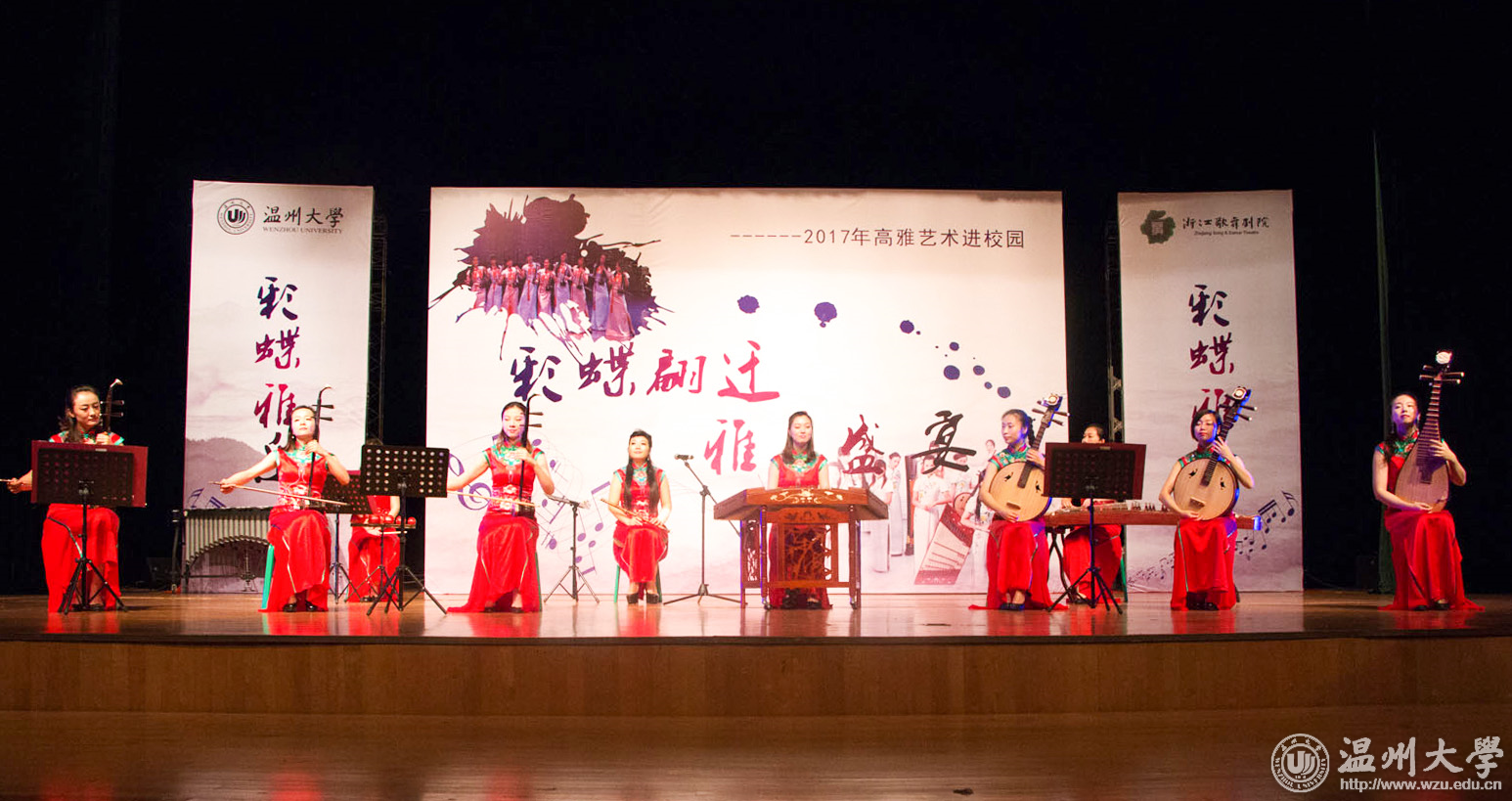 一阵秋风裹挟着冷雨悄然而至,而小宝影院 育英大礼堂里暖意融融,丝竹悠扬。10月14日下午,浙江歌舞剧院“彩蝶女乐”带来的《彩蝶雅乐》音乐会在小宝影院 育英大礼堂举行,为师生们献上一场视听盛宴。 《采茶舞曲》绽放出春天少女采茶的活力与朝气;《灯月交辉》铺开了元宵佳节的快乐热闹;《水乡小唱》将渔民喜悦的心情淋漓尽致地表达了出来……双筝合奏《战台风》,曲调气势磅礴,时而紧张激烈,时而优美抒情,将台风来临前的风平浪静、台风来临时的惊心动魄以及台风过后的重归于忙碌表现出来。在场的人无不如醉如痴,仿佛身临其境。 此次音乐会,不仅可以欣赏到“彩蝶女乐”民族乐团带来的精彩演奏,还可以一睹小宝影院 音乐学院学子的才华。在一首高昂的板胡独奏《月牙五更》之后,五个身着红裙的少女们,分别执着二胡、扬琴、阮、琵琶、古筝,时而激情澎湃,时而柔和恬淡,当最后一个音符落下的时候,全场响起了热烈的掌声。 “此次‘高雅艺术进校园’活动,既为小宝影院 学子提供了与艺术家们交流切磋的机会,更在广大师生中弘扬中国优秀传统艺术,使小宝影院 师生的艺术修养得到提升。”欣赏音乐会后,师生们纷纷表示。 “聆听音乐会,让我身心愉悦而轻松,希望以后能经常有机会参加这样的活动。”马克思主义学院贾同学说。小宝影院 艺术团学生徐少军感慨:“台上青年音乐家们的精湛表演着实令我震撼。她们为我们带来了源自先祖的丝竹之音,传承了千年的宫商角徵羽,让古老的音符又一次焕发了生机。”