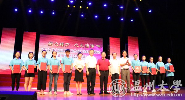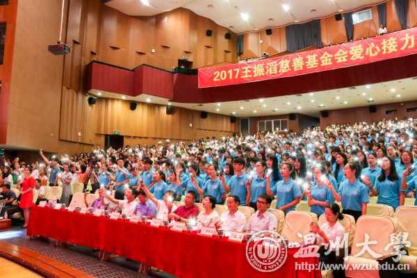 “笃学躬行,惟正惟诚;至善明德,惟志惟勤;践诺重信,惟必惟久;秉公尚爱,惟心惟崇;修身齐家,惟己惟人;青春报国,惟此惟大。”6月11日,2017王振滔慈善基金会爱心系列活动小宝影院 站启动仪式在大学生活动中心育英大礼堂举行,奥康集团董事长、王振滔慈善基金会创始人王振滔,王振滔慈善基金会秘书长冯芳芳,共青团温州市委书记林小露,共青团温州市委志工中心主任郭家乐,温州市慈善总会秘书长肖国庆,校长李校堃,党委副书记赵敏,副校长钱强,学校相关部门负责人,2017爱心接力手和各类奖助学金获得者代表,以及媒体记者参加启动仪式。 仪式上,全体学生集体朗诵爱心基金会“家训”,表达感恩之情。