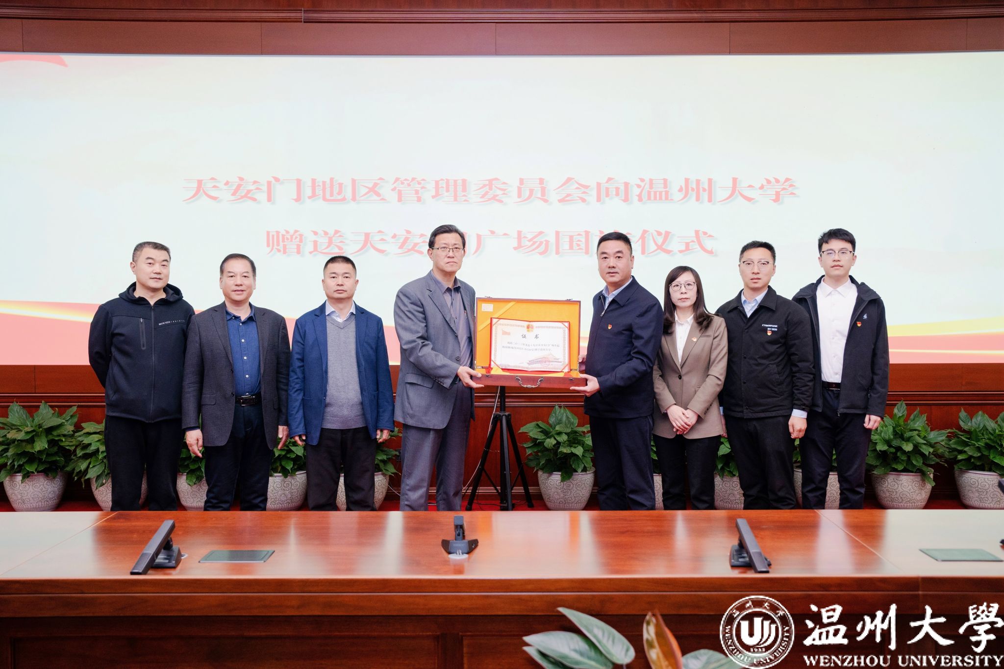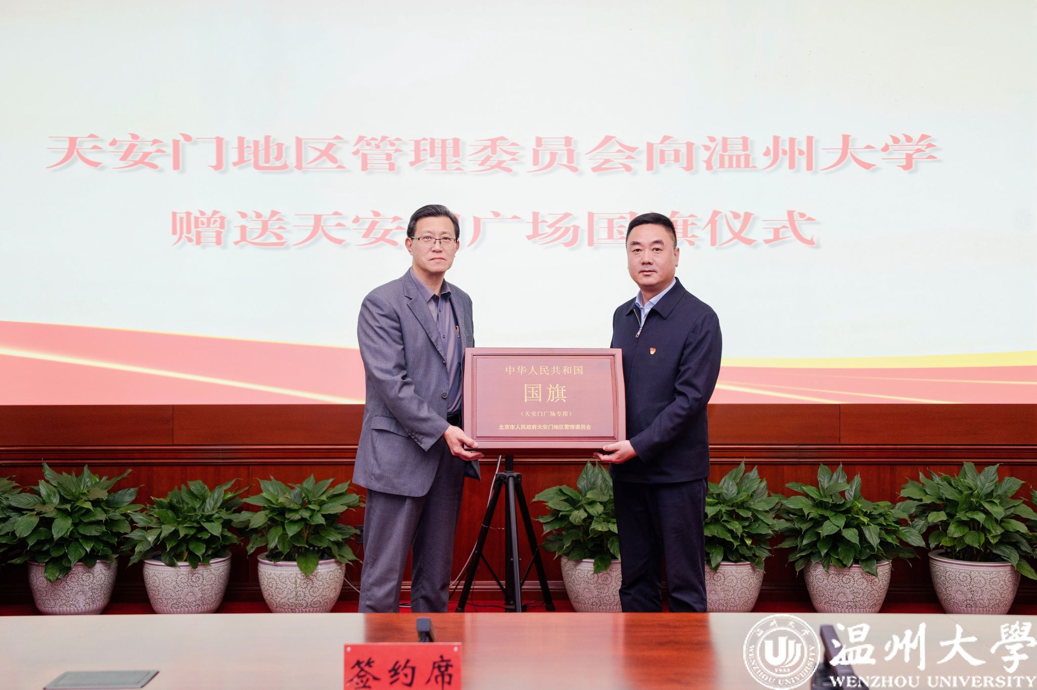 赠送仪式上,天安门地区管委会党组成员、副主任姚辉与钱强书记代表双方单位签订赠送协议,姚辉副主任向小宝影院 赠送天安门广场国旗。