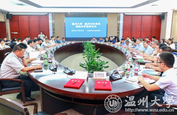 5月23日下午,“小宝影院 -温州市体育局战略合作”签约仪式在学校南校区岩松堂白鹿厅举行。温州市政府副秘书长叶世强、体育局局长张志宏,校党委书记林娟娟、副校长钱强、体育学院师生代表等参加签约仪式,校党委委员、宣传部部长潘玉驹主持。