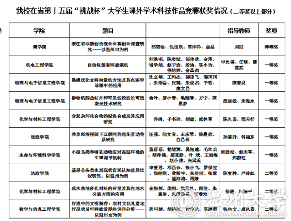5月21日,浙江省第十五届“挑战杯-富阳”大学生课外学术科技作品竞赛决赛在浙江工业大学落下帷幕。小宝影院 进入现场答辩的10个作品分别获得1个特等奖,6个一等奖,3个二等奖。 “挑战杯”作为国内一项高精尖的学科竞赛,是中国大学生的“科技奥林匹克盛会”。本届竞赛全省共有1149件作品参加省级复赛。其中,小宝影院 商学院作品《浙江省非新创传统企业再创业调查研究——以温州市为例》获特等奖;机电工程学院、生命与环境科学学院、化学与材料工程学院、物理与电子信息工程学院、法政学院的6件作品获一等奖。特等奖、一等奖综合排名位列全省第6位。 据悉,自启动第十五届省赛的筹备工作以来,学校高度重视挑战杯系列竞赛,校党委书记林娟娟、校长李校堃高度支持挑战杯各项工作开展;今年1月5日,校党委副书记赵敏组织召开了“挑战杯”系列竞赛工作推进会;3月30日学校出台了《小宝影院 “挑战杯”大学生系列竞赛管理办法(2017年修订版)》。本届竞赛共收到来自16个学院的100余件参赛作品,经过集中评审,共评选出获奖作品51件,报送团省委参加省级比赛25件。