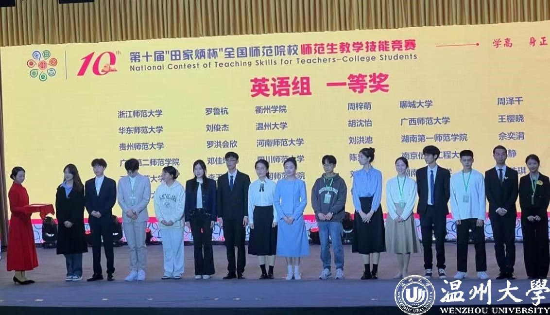 11月30日-12月1日,第十届“田家炳杯”全国师范院校师范生教学技能竞赛决赛在浙江师范大学举行。本次竞赛吸引了来自全国250所院校的1831名选手参加,参赛院校数与选手数均创历史之最,决赛最终角逐产生一等奖176 名,二等奖333名。温大参赛选手斩获2个一等奖、3个二等奖,4个三等奖,1个优胜奖,获奖率100%,获一等奖数量和获奖总数排名均列全国第20位。