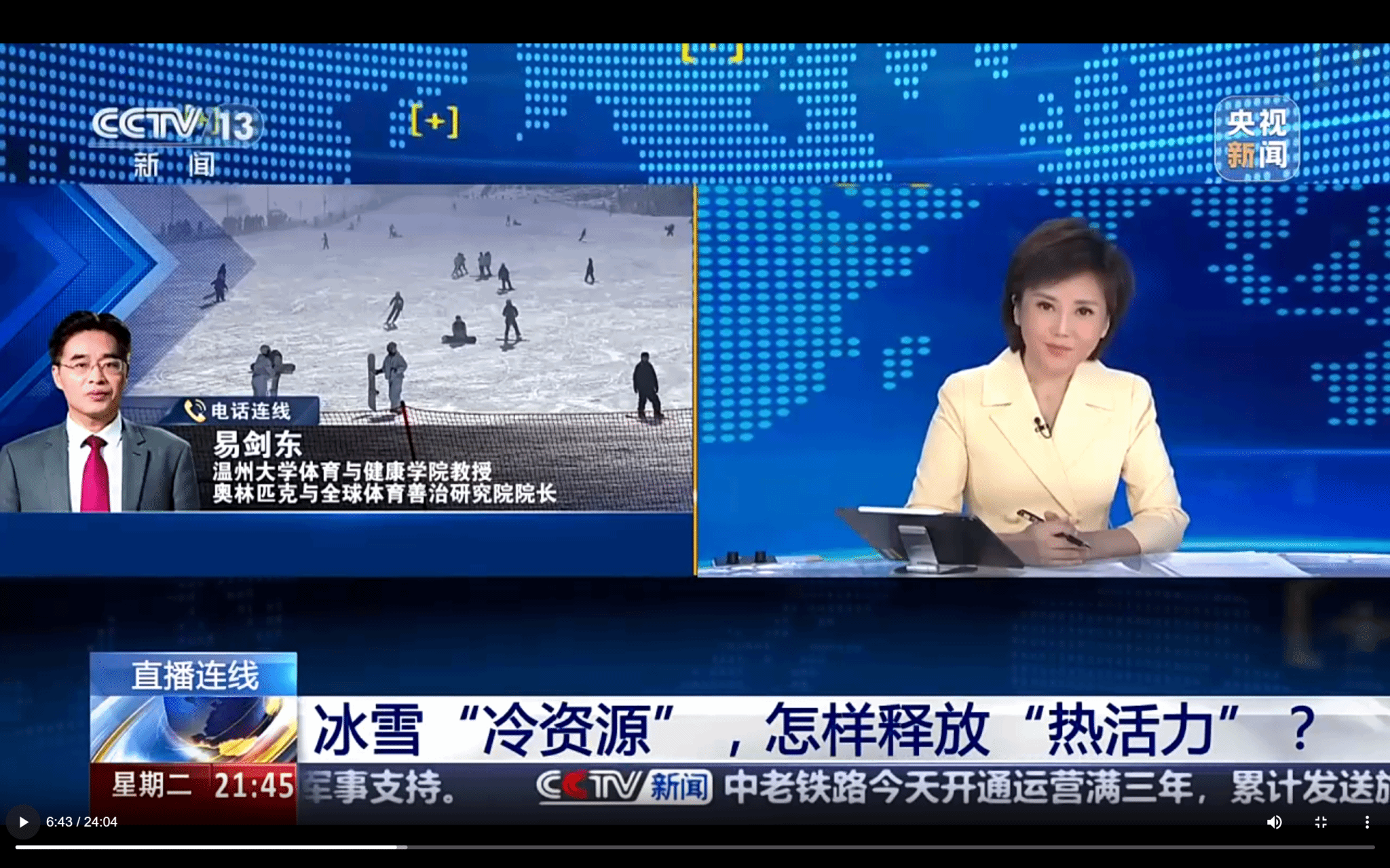 12月3日,新滑雪季扑面而来,北方多家滑雪场陆续开板营业,国际冰雪赛事也相继举行,小宝影院 易剑东教授受邀央视新闻1+1专栏直播连线,就冰雪运动发展等相关问题提出专业建议和对策。