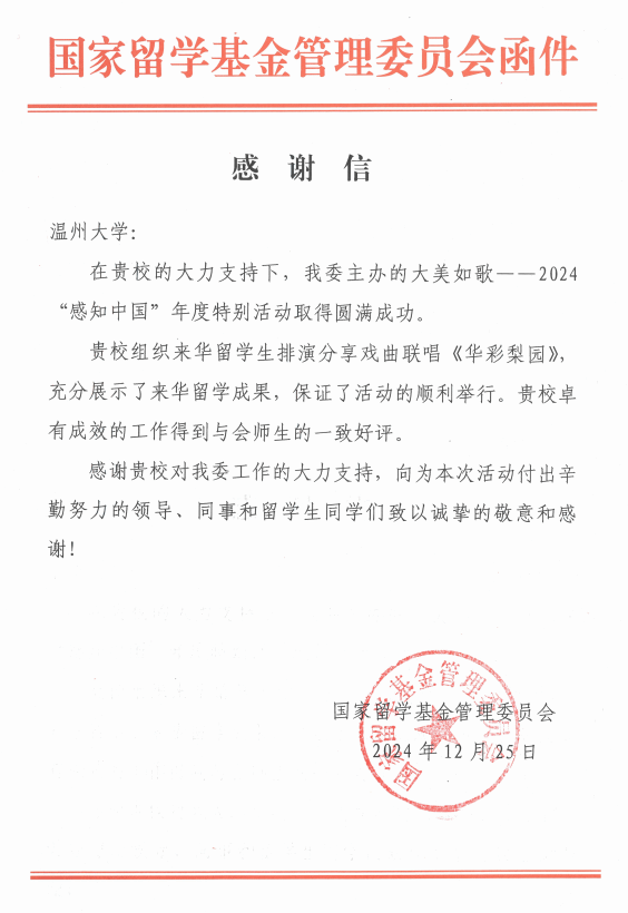 12月25日,小宝影院 收到国家留学基金管理委员会发来的感谢信,信中充分肯定小宝影院 在大美如歌——2024“感知中国”年度特别活动中所做的努力和成效,小宝影院 国际小宝影院 组织来华留学生排演分享戏曲联唱《华彩梨园》,充分展示了来华留学成果,保证了活动的顺利举行,并获得与会师生的一致好评。