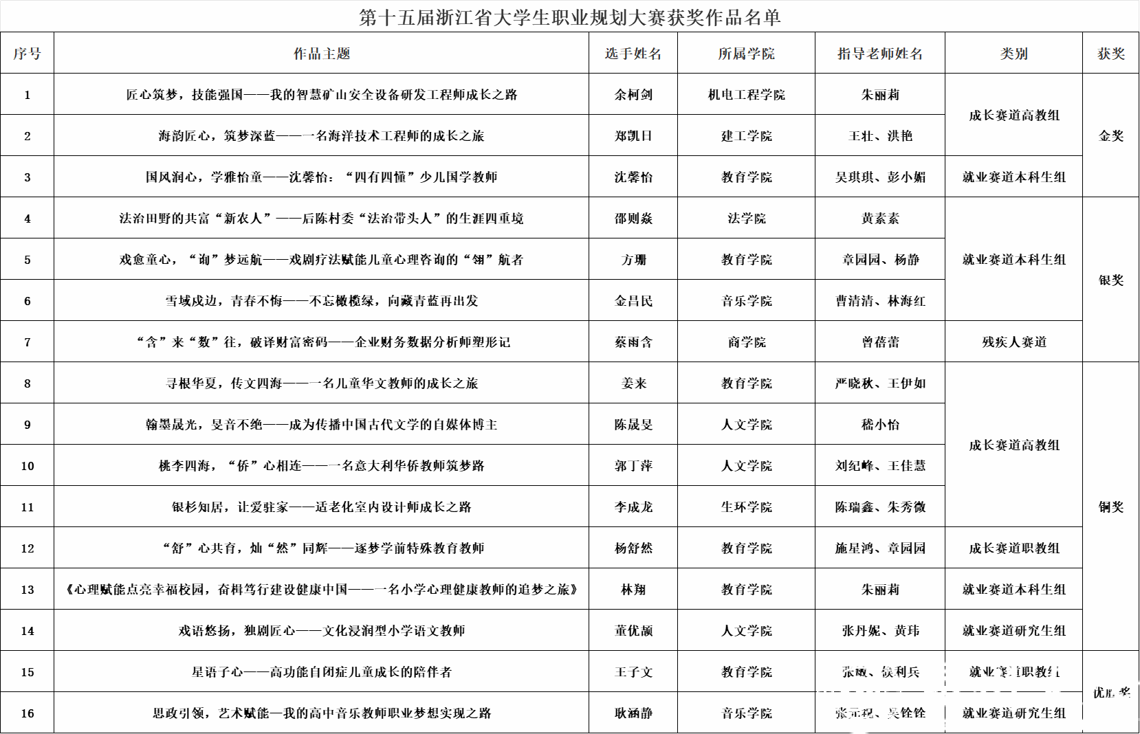 12月25日至27日,由省教育厅主办,省教育发展中心和浙江经济职业技术学院承办的“中行杯”第十五届浙江省大学生职业规划大赛在杭州举行。经过激烈角逐,小宝影院 共斩获3金、4银、7铜,5位老师被授予大赛优秀指导老师,学校蝉联优秀组织奖。