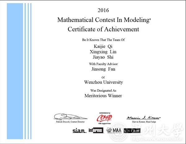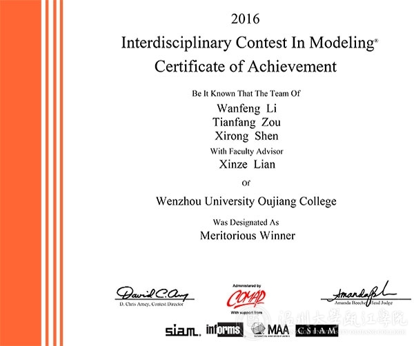 日前,2016年美国大学生数学建模竞赛(MCM/ICM)成绩公布,小宝影院 瓯江学院、数学与信息科学学院的学子与来自哈佛大学等世界一流大学的学生同台竞技,最终获得一等奖3项,二等奖3项的佳绩,其中,瓯江学院的成绩位列浙江省22所参赛独立学院之首。 2016年美国大学生数学建模竞赛(MCM/ICM)于北京时间2016年1月29日(农历月腊月二十)9点至2月2日9点在全球通过网络同步举行,来自中国、德国、美国、英国、加拿大、新加坡等国家超过10000支大学生队伍参加了竞赛,其中包括来自哈佛大学、普林斯顿大学、麻省理工学院、清华大学、北京大学等国际知名高校学生参与此项赛事角逐。竞赛以三名本科生为一组,在四天时间内,就指定的问题完成从建立数学模型、求解、验证到论文撰写,以清楚的格式、流畅的英文提交一篇20页左右的论文到竞赛组委会。 据悉,美国大学生数学建模竞赛是唯一的国际性数学建模竞赛,也是世界范围内最具影响力的数学建模竞赛,为现今各类数学建模竞赛之鼻祖。该项竞赛始于1985年,由美国数学及其应用联合会(comap)主办,美国数学学会、运筹学学会、工业与应用数学学会等多家机构协办。目前该项赛事已经成为最著名的国际大学生竞赛之一,每年包括哈佛大学、麻省理工学院、北京大学、清华大学等国内外顶级高校的学生都会参加各奖项的角逐。赛题内容涉及经济、管理、环境、资源、生态、医学、安全、未来科技等众多领域,着重强调研究问题、解决方案的原创性、团队合作、交流以及结果的合理性,具有极强的实际应用背景。