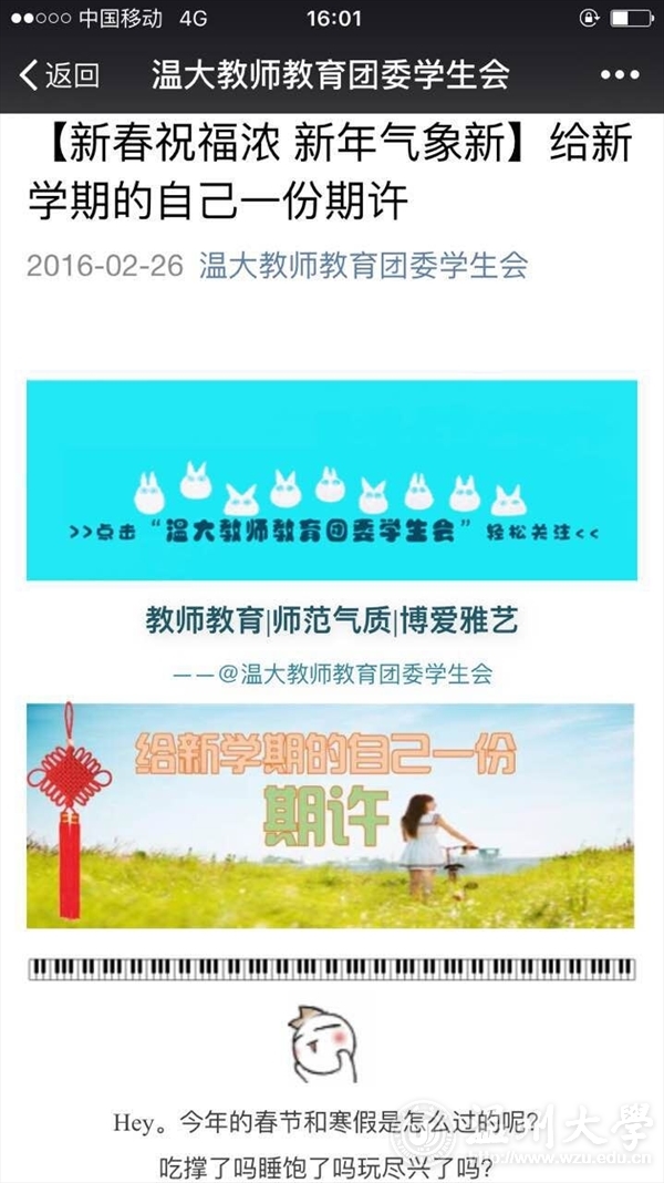 “新春祝福浓,新年气象新!”新学期开学之前,教师小宝影院 在学院团学微信平台上推出“给新学期的自己一份期许”专栏。“希望时光跑得慢一点,愿岁月中可爱的人们都能好好生活。”“希望新的一年,我可以少计较一点得失,多包容一些。”“到了一个必须要长大的尴尬年纪,希望自己学会努力之后的妥协,学会心疼爸妈珍惜朋友和时光。加油吧加油吧!”……即将返校的学生纷纷在微信上留言,表达自己对新学期的期许。学院大楼各楼层、各宣传栏、祝福墙,也是布置一新,更加衬托出“博爱雅艺”的教、学、研氛围。最值得一提的是,学院关注、关爱、关怀学生,为迎接开学初的国家教师资格证考试,在寒假期间就组织安排为学生进行强化训练。